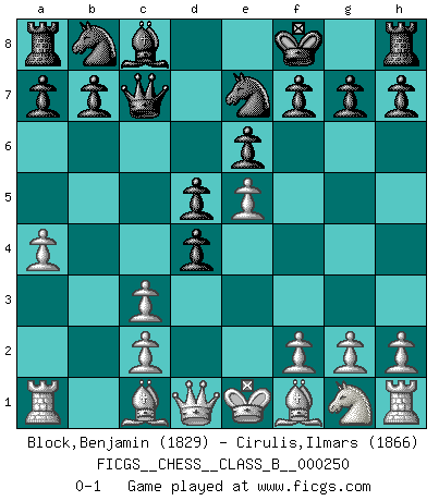 Last move : 0-1 2017 January 14 12:1:30 [Event "FICGS__CHESS__CLASS_B__000250"] [Site "FICGS"] [Date "2016.11.22"] [Round "1"] [White "Block,Benjamin"] [Black "Cirulis,Ilmars"] [Result "0-1"] [WhiteElo "1829"] [BlackElo "1866"] 1.e4 e6 2.d4 d5 3.Nc3 Bb4 4.e5 Ne7 5.a3 Bxc3+ 6.bxc3 c5 7.Qg4 Kf8 8.a4 Qc7 9.Qd1 cxd4 0-1 This chess game has been lost on time (started : 2016.11.22 14:57:55) French : Winawer, Advance variation Player Black won this chess game. Follow this game move after move (download)If your opponent offers you a draw, try to work out why he thinks he's worse off. (Nigel Short) Wenn Capablanka heute auf der Schachbühne erscheinen würde, hätte er ein halbes Jahr gebraucht um sich die Schachtheorie anzueignen. Und dann hätte er alles und jeden besiegt. (Mikhail Moiseyevich Botvinik) En el Ajedrez, cuando menos, el valiente hereda la tierra. (Edmar Mednis) Aidez vos pièces, elles vous aideront. (Paul Morphy) Unless I accept my faults I will most certainly doubt my virtues. (Hugh Prather)
