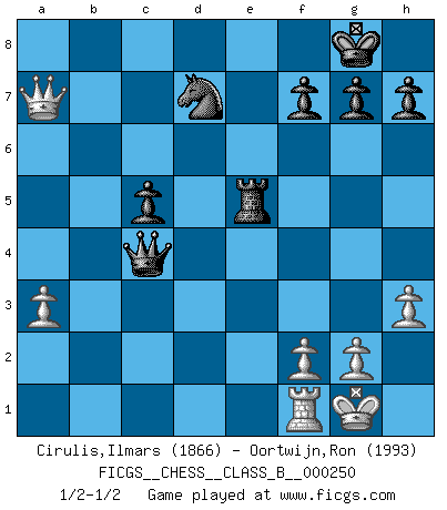 Last move : 1/2-1/2 2017 February 4 13:9:24 [Event "FICGS__CHESS__CLASS_B__000250"] [Site "FICGS"] [Date "2016.11.22"] [Round "1"] [White "Cirulis,Ilmars"] [Black "Oortwijn,Ron"] [Result "1/2-1/2"] [WhiteElo "1866"] [BlackElo "1993"] 1.b4 e6 2.a3 Nf6 3.e3 Be7 4.c4 b6 5.d4 c5 6.bxc5 bxc5 7.d5 exd5 8.cxd5 d6 9.Nc3 O-O 10.Bd2 Nbd7 11.Nf3 Nb6 12.e4 Re8 13.Bd3 Bg4 14.h3 Bxf3 15.Qxf3 Nfd7 16.Rb1 Ne5 17.Qe2 Nxd3+ 18.Qxd3 Bf6 19.O-O Qe7 20.Rfe1 Be5 21.Ne2 Rab8 22.Bc3 Nd7 23.Qa6 Rxb1 24.Rxb1 Bxc3 25.Nxc3 Qe5 26.Nb5 Qxe4 27.Rf1 Re5 28.Nxd6 Qxd5 29.Nc4 Qe6 30.Qxa7 Qxc4 1/2-1/2 Polish (Sokolsky) opening Kingside Castling by player Black (move 9) Kingside Castling by player White (move 19) This chess game ended in a draw. Follow this game move after move (download)Human affairs are like a Chess game: only those who do not take it seriously can be called good players. (Hung Tzu Ch'eng) Die größte Kunst beim Schach besteht darin dem Gegner nicht zu zeigen was er tun kann. (Garry Kasparov) No nos podemos resistir a la fascinación de un sacrificio ya que la pasión por los sacrificios es parte de la naturaleza de un jugador de Ajedrez. (Rudolf Spielman) Dieu déplace le joueur, et celui-ci la pièce. Quel Dieu derrière Dieu commence donc la trame ? Arturo Perez-Reverte (prix de littérature policière 1993). Strategy without tactics is the slowest route to victory. Tactics without strategy is the noise before defeat. (Sun Tzu)