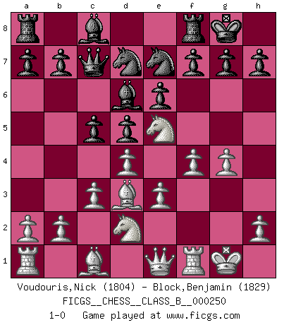 Last move : 1-0 2017 February 17 15:52:4 [Event "FICGS__CHESS__CLASS_B__000250"] [Site "FICGS"] [Date "2016.11.22"] [Round "1"] [White "Voudouris,Nick"] [Black "Block,Benjamin"] [Result "1-0"] [WhiteElo "1804"] [BlackElo "1829"] 1.d4 d5 2.e3 c5 3.c3 Nc6 4.f4 Nf6 5.Bd3 e6 6.Nf3 Bd6 7.O-O O-O 8.Ne5 Qc7 9.Nd2 Ne7 10.g4 Nd7 11.Qe1 1-0 This chess game has been lost on time (started : 2016.11.22 14:57:55) Queen's pawn game Kingside Castling by player White (move 7) Kingside Castling by player Black (move 7) Player White won this chess game. Follow this game move after move (download)The passion for playing Chess is one of the most unaccountable in the world. (H.G. Wells) Kostenjuk hat keinen Sexappeal. (Loek van Wely) El Ajedrez es realmente noventa y nueve por ciento calculación. (Soltis) Le thème de l'attaque double intervient d'une manière ou d'une autre dans l'immense majorité des combinaisons. (Youri Averbakh) There are two major products that came out of Berkeley: LSD and UNIX. We do not believe this is to be a coincidence. (Jeremy S. Anderson)