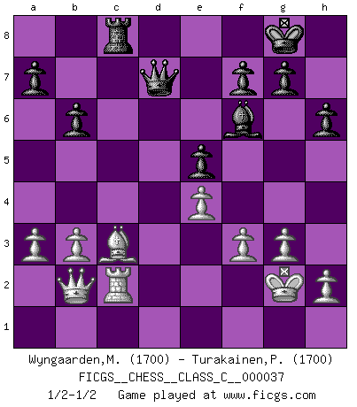 Last move : 1/2-1/2 2007 September 18 4:24:43 [Event "FICGS__CHESS__CLASS_C__000037"] [Site "FICGS"] [Date "2007.03.31"] [Round "1"] [White "Wyngaarden,Martin"] [Black "Turakainen,Pekka I."] [Result "1/2-1/2"] [WhiteElo "1700"] [BlackElo "1700"] 1.d4 Nf6 2.c4 e6 3.Nf3 b6 4.g3 Bb7 5.Bg2 Be7 6.O-O O-O 7.Nc3 Ne4 8.Qc2 Nxc3 9.Qxc3 c5 10.Rd1 d6 11.b3 Bf6 12.Bb2 Qe7 13.Rac1 Nc6 14.Qd2 Rad8 15.e3 Rfe8 16.Bc3 h6 17.Qb2 Qc7 18.a3 cxd4 19.Nxd4 Nxd4 20.Bxd4 Bxg2 21.Kxg2 Qb7 22.f3 e5 23.Bc3 d5 24.cxd5 Rxd5 25.e4 Rd7 26.Rxd7 Qxd7 27.Rc2 Rc8 1/2-1/2 Queen's Indian : Old Main line, 7.Nc3 Kingside Castling by player White (move 6) Kingside Castling by player Black (move 6) This chess game ended in a draw. Follow this game move after move (download)Pawn endings are to Chess what putting is to golf. (Cecil Purdy) Fischer: 'Remis!?' Uhlmann: 'Aber es muss doch dreimal Zugwiederholung sein!' Fischer: 'Sie nehmen das Remis an, wie ich es sage, sonst spiele ich weiter und werde Sie dann schlagen!' (Robert James Fischer) Los problemas de Ajedrez exigen del compositor las mismas virtudes que caracterizan todo el arte de valor: originalidad, invención, concisión, armonía, complejidad e insinceridad explendida. (Vladimir Nabokov) Je ne crois pas en la psychologie, je crois aux bons coups. (Robert Fischer) Control your own destiny or someone else will. (Jack Welch)
