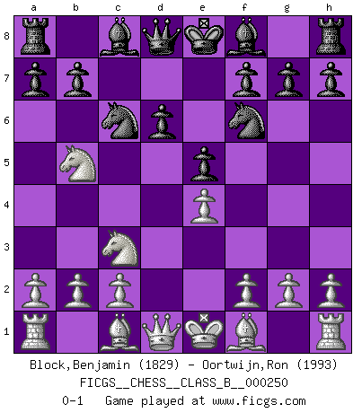 Last move : 0-1 2017 January 13 23:55:32 [Event "FICGS__CHESS__CLASS_B__000250"] [Site "FICGS"] [Date "2016.11.22"] [Round "1"] [White "Block,Benjamin"] [Black "Oortwijn,Ron"] [Result "0-1"] [WhiteElo "1829"] [BlackElo "1993"] 1.e4 c5 2.Nf3 Nc6 3.d4 cxd4 4.Nxd4 Nf6 5.Nc3 e5 6.Ndb5 d6 0-1 This chess game has been lost on time (started : 2016.11.22 14:57:55) Sicilian : Pelikan (Lasker/Sveshnikov) variation Player Black won this chess game. Follow this game move after move (download)We must make sure that Chess will not be like a dead language, very interesting, but for a very small group. (Sytze Faber) Schach ist mein Leben, meine Leidenschaft, was ich gelernt habe und seit meinem 14. Lebensjahr profimässig praktiziere. Darauf zu verzichten, würde mir sehr schwer fallen. (Viktor Kortschnoi) El juego de Damas es para vagabundos. (Paul Morphy) Aux échecs, les retours au sommet sont rares : les dommages psychologiques consécutifs à une défaite sont trop sévères. (Daily Telegraph) Memory... is the diary that we all carry with us. (Oscar Wilde, The Importance of Being Earnest)