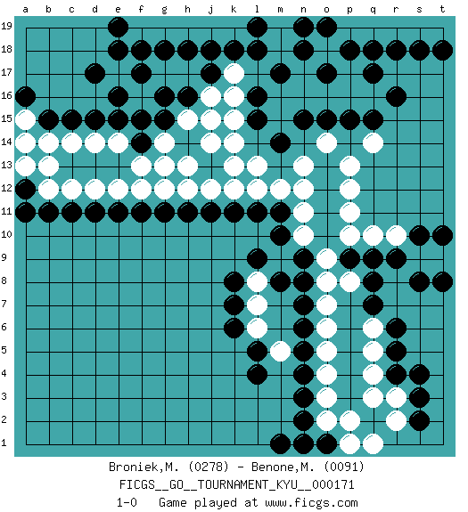 Last move : 1-0 2017 March 28 22:1:19 [Event "FICGS__GO__TOURNAMENT_KYU__000171"] [Site "FICGS"] [Date "2016.11.22"] [Round "1"] [Black "Broniek,Mariusz Maciej"] [White "Benone,Mateia"] [Result "1-0"] [Rating 1 "0278"] [Rating 2 "0091"] 1.r16 q16 2.q15 p16 3.p15 o16 4.n15 m16 5.l15 k16 6.m17 n16 7.l16 m15 8.m14 o14 9.o15 n17 10.n18 o18 11.o19 p19 12.p18 q19 13.q18 r19 14.r18 s19 15.t18 t19 16.s18 m18 17.o17 p17 18.q17 j16 19.l18 m19 20.l19 k19 21.n19 k17 22.k18 j19 23.j18 h19 24.h18 g19 25.g18 f19 26.f18 n13 27.e19 m12 28.o13 p13 29.o12 p12 30.o11 p11 31.o10 p10 32.p9 o9 33.n9 o8 34.q9 q10 35.r9 r10 36.s10 s9 37.s8 t9 38.t8 n10 39.m11 n11 40.t10 n12 41.l11 l12 42.k11 k12 43.j11 j12 44.h11 h12 45.g11 g12 46.f11 f12 47.e11 e12 48.d11 l13 49.n8 o7 50.n7 o6 51.n6 o5 52.n5 o4 53.n4 o3 54.n3 o2 55.n2 n1 56.m1 p1 57.o1 p2 58.n1 d12 59.c11 c12 60.b11 b12 61.a12 a13 62.a11 b13 63.j17 k14 64.h16 k15 65.m10 h15 66.g15 g14 67.h14 j15 68.f14 g13 69.j13 k13 70.a14 b14 71.b15 a15 72.c15 f15 73.g16 j14 74.a16 a14 75.e15 f16 76.e16 e17 77.f17 h13 78.d17 d14 79.e18 e14 80.f15 f13 81.d15 m9 82.m8 l8 83.l9 p8 84.q8 c14 85.k8 l7 86.k7 l6 87.k6 q3 88.q7 q6 89.r6 q5 90.r5 q4 91.r4 r3 92.s3 r2 93.s4 q1 94.s2 q14 95.l5 m5 96.l4 1-0 Here are the names of the openings (joseki) played in the four corners : Corner q16 : r16 q16 Komoku (Somok, Xiao~mu`) 3-4 Point. The komoku (3-4) point is the traditional corner enclosure move.. Corner q4 : p9 o9 This joseki is unknown. A weak or weird move has probably been played in this corner. Player Black won this Go (weiqi, baduk) game. Follow this game move after move (download)Eyes win semiais. (Anonymous) There is a very easy way to return from a casino with a small fortune : go there with a large one. (Jack Yelton)