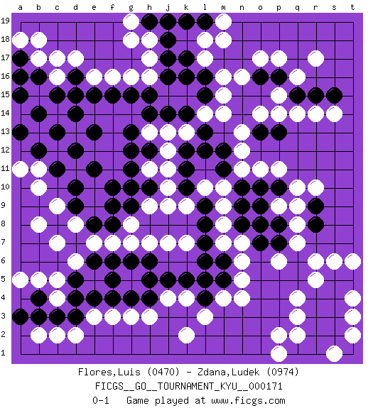 Last move : 0-1 2017 April 11 20:27:12 [Event "FICGS__GO__TOURNAMENT_KYU__000171"] [Site "FICGS"] [Date "2016.11.22"] [Round "1"] [Black "Flores,Luis"] [White "Zdana,Ludek"] [Result "0-1"] [Rating 1 "0470"] [Rating 2 "0974"] 1.d4 q16 2.d16 q4 3.k16 q10 4.d10 k4 5.j5 h3 6.h4 j4 7.h5 g3 8.g4 n4 9.k5 e3 10.f4 f3 11.e4 c7 12.d3 f7 13.e8 e7 14.f8 d8 15.d9 c9 16.c11 b8 17.e11 c5 18.d5 d6 19.e6 g7 20.f6 j7 21.g6 h7 22.h6 c4 23.c3 j10 24.k11 g8 25.g9 h9 26.f9 g10 27.f10 c14 28.c15 c17 29.d14 d17 30.b14 e16 31.e15 f16 32.f15 h16 33.g15 g16 34.h15 n16 35.j16 h18 36.j18 h17 37.j17 c16 38.d15 j11 39.k10 k9 40.g11 j12 41.k12 j13 42.j14 k13 43.l13 l14 44.l12 m14 45.k14 n13 46.m12 n12 47.h10 h11 48.g10 m10 49.l9 l10 50.m11 n11 51.n10 m9 52.l8 r6 53.n9 m8 54.l7 m7 55.l6 q14 56.o10 p11 57.p10 o11 58.n8 n7 59.o7 n6 60.m6 n5 61.m5 m4 62.l4 l3 63.l5 q9 64.p8 o8 65.o9 p9 66.o8 q7 67.p7 p6 68.b4 b5 69.b3 k2 70.g12 l17 71.l16 m16 72.k17 l18 73.l15 m15 74.h14 j9 75.h12 h13 76.g13 r17 77.r15 r14 78.r3 q3 79.r4 r5 80.r2 q2 81.q1 p1 82.r1 p2 83.s5 s6 84.t5 t6 85.s4 t3 86.s2 t2 87.t1 s1 88.s3 t4 89.d12 a11 90.b12 b10 91.c13 d2 92.f5 c2 93.a3 a5 94.h19 g18 95.b16 b17 96.a17 b18 97.a15 a18 98.a16 g19 99.j19 b2 100.o13 o14 101.p13 p14 102.q15 p15 103.s15 s14 104.p16 p17 105.a13 b11 106.e13 k7 107.l19 m19 108.k19 m18 109.o16 o17 110.r9 r10 111.r8 q8 0-1 Here are the names of the openings (joseki) played in the four corners : Player White won this Go (weiqi, baduk) game. Follow this game move after move (download)Use a wall to attack, not to make territory. (Anonymous) Somewhere in the world there is an epigram for every dilemma. (Hendrik Willem van Loon)