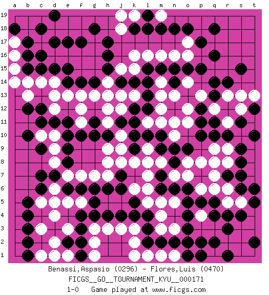 Last move : 1-0 2017 April 18 1:43:26 [Event "FICGS__GO__TOURNAMENT_KYU__000171"] [Site "FICGS"] [Date "2016.11.22"] [Round "1"] [Black "Benassi,Aspasio"] [White "Flores,Luis"] [Result "1-0"] [Rating 1 "0296"] [Rating 2 "0470"] 1.q16 d4 2.q4 c17 3.e17 d16 4.f3 e3 5.c15 c14 6.d15 d14 7.e15 e16 8.f17 f16 9.f4 f15 10.e14 e13 11.f14 f13 12.g14 c16 13.b15 b14 14.h16 g16 15.h17 g15 16.h15 g17 17.g18 a15 18.b16 a14 19.c6 a16 20.b17 b18 21.c18 a17 22.c9 d13 23.k4 j3 24.j4 k3 25.l3 k2 26.l2 h3 27.h4 g3 28.f2 l1 29.n2 n1 30.o2 m3 31.m2 k1 32.g4 m4 33.l4 m1 34.q10 r9 35.r10 g13 36.d17 h13 37.r7 h14 38.q14 q8 39.s9 q9 40.s8 q7 41.b4 c3 42.e6 g2 43.b3 d2 44.b2 c1 45.o9 o8 46.n8 p8 47.n9 n7 48.m7 o7 49.m6 m5 50.n6 n5 51.o6 p6 52.p5 r6 53.s6 r5 54.r4 s5 55.q5 q6 56.s4 t4 57.t6 s3 58.t5 t3 59.r3 r2 60.q2 q1 61.p2 s1 62.t2 s2 63.p17 o14 64.n15 n13 65.l14 p13 66.c16 c19 67.q13 o12 68.q18 m13 69.l13 m12 70.k11 l11 71.k10 n11 72.f10 f11 73.g10 h11 74.h10 j10 75.j11 j9 76.k9 h9 77.e10 j12 78.g11 h12 79.k12 k13 80.k14 j13 81.c12 j15 82.l12 k8 83.m10 l8 84.b12 l9 85.l10 m11 86.j14 k15 87.l15 k16 88.o15 n10 89.m9 l7 90.j7 l6 91.o5 l5 92.f1 g1 93.e11 f12 94.p11 l16 95.n14 n16 96.k18 m16 97.m18 o16 98.p15 q12 99.p12 o11 100.p10 r8 101.s7 m14 102.m15 o17 103.o18 m19 104.n18 j18 105.l18 j19 106.s15 e5 107.f6 d6 108.d7 d5 109.c7 c5 110.b5 f7 111.g6 h7 112.j6 g7 113.o1 r13 114.r14 s13 115.s11 s12 116.t12 r11 117.q11 t11 118.t10 m8 119.o4 e1 120.e2 d1 121.d19 b19 122.a18 a19 123.a18 b13 124.pass j8 125.pass d12 126.c11 c10 127.b10 d10 128.d11 d9 129.e9 d8 130.e8 e7 131.h6 h8 132.b1 k6 133.k5 f5 134.g5 n3 135.o3 t1 136.p1 k19 137.l19 p4 138.r1 t13 139.t2 1-0 Here are the names of the openings (joseki) played in the four corners : Corner d16 : c17 e17 San-San (Sam-Sam, San-San) 3-3 Point. The San-San (3-3) point, emphasizing territory at the expense of influence. Ikken Kakari (Hankan Keolch'im, Yi Gua`, Jiao~, 1-Space Approach). White may continue by playing 4-5, 3-5, 4-6, 3-6 or 5-4. Corner d4 : d4 f3 Hoshi (Hwajeom, Seongjeom, Xingwei`) 4-4 Point. The star or hoshi (4-4) point, emphasizing influence at the potential expense of territory. Ikken Kakari (Hankan Keolch'im, Yi Gua`jiao~, 1-Space Low Approach). Black 2 is the standard approach move to the 4-4. Player Black won this Go (weiqi, baduk) game. Follow this game move after move (download)A basic: Don't push too hard. (Jansteen) All war is based on deception. (Sun Tzu)