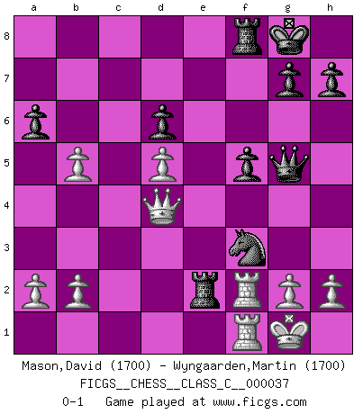 Last move : 0-1 2007 April 25 23:15:48 [Event "FICGS__CHESS__CLASS_C__000037"] [Site "FICGS"] [Date "2007.03.31"] [Round "1"] [White "Mason,David"] [Black "Wyngaarden,Martin"] [Result "0-1"] [WhiteElo "1700"] [BlackElo "1700"] 1.e4 c5 2.Nf3 d6 3.d4 cxd4 4.Nxd4 Nf6 5.Nc3 a6 6.Be2 e5 7.Nb3 Be7 8.O-O O-O 9.Bg5 Be6 10.Bxf6 Bxf6 11.Nd5 Bg5 12.Nd2 Bxd5 13.exd5 Nd7 14.Nf3 e4 15.Nxg5 Qxg5 16.Qd4 f5 17.f4 exf3 18.Bxf3 Rac8 19.c4 Ne5 20.Be2 b5 21.cxb5 Rc2 22.Rf2 Rxe2 23.Raf1 Nf3+ 0-1 Sicilian : Najdorf, Opovcensky variation Kingside Castling by player White (move 8) Kingside Castling by player Black (move 8) Player Black won this chess game. Follow this game move after move (download)The battle for the ultimate truth will never be won. And that's why Chess is so fascinating. (Hans Kmoch) Bobby Fischer ist kein Vorbild für die heutige Jugend. (Viktor Kortschnoi) El Ajedrez, como la música, como el amor, tiene el poder de hacer feliz a la gente. (Siegbert Tarrasch) Botvinnik disait en comparant les échecs à la musique: Il existe une science dont le but est l'étude de l'acoustique et des sons. Mais il y a aussi un art qui se sert de l'océan des sons : c'est la musique. De toute évidence, il en est de même pour la pensée. La logique est l'étude des lois de la réflexion et les échecs reflètent, en tant qu'art, le côté logique de la réflexion, sous la forme d'images artistiques... Extrait de Fischer - Spassky, Reykjavik 1972 par Alexander & F. Wyndham (Ed. Solar), p 37. If you are going through hell, keep going. (Winston Churchill)