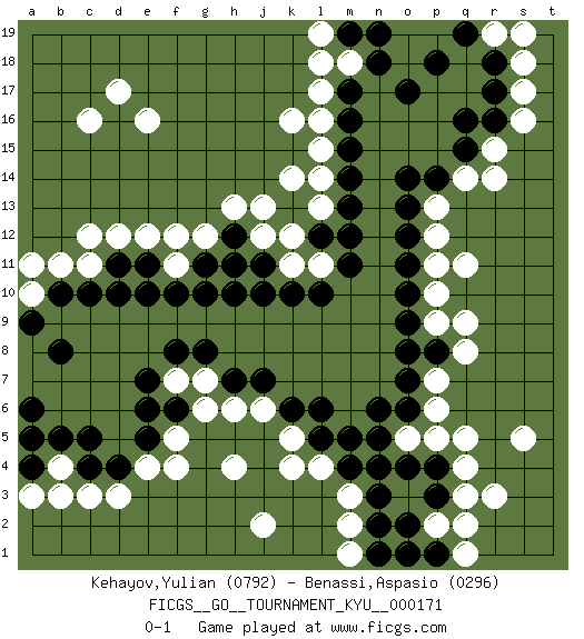 Last move : 0-1 2017 March 11 18:30:8 [Event "FICGS__GO__TOURNAMENT_KYU__000171"] [Site "FICGS"] [Date "2016.11.22"] [Round "1"] [Black "Kehayov,Yulian"] [White "Benassi,Aspasio"] [Result "0-1"] [Rating 1 "0792"] [Rating 2 "0296"] 1.d4 q4 2.q16 e16 3.p3 q3 4.p4 p5 5.o4 o5 6.n4 r14 7.o17 q11 8.e7 k16 9.m17 c3 10.c4 d3 11.d10 e4 12.e5 f5 13.e6 l4 14.n5 q5 15.n6 h4 16.l6 c12 17.c10 e12 18.m14 k14 19.k10 b4 20.b5 b3 21.c5 q8 22.o7 d17 23.e10 g12 24.g10 s16 25.r17 l17 26.m16 a5 27.a6 k12 28.m12 f4 29.a4 b11 30.b10 s17 31.r18 p13 32.o14 s5 33.o10 p9 34.o9 m3 35.n3 k5 36.k6 h6 37.h7 j6 38.j7 h11 39.h10 l11 40.l10 r3 41.m11 g7 42.g8 f7 43.f8 s18 44.p14 q14 45.q15 m18 46.n18 l18 47.o13 p12 48.o12 r19 49.q19 s19 50.p18 a3 51.a5 m2 52.n2 p7 53.o8 l15 54.m15 a10 55.a9 a11 56.b8 c16 57.l12 k11 58.n19 l13 59.m13 l14 60.j11 j12 61.j10 f11 62.f10 p2 63.o2 q2 64.m5 m1 65.n1 p10 66.l5 k4 67.f6 g6 68.r16 r15 69.m19 l19 70.o11 c11 71.g11 p11 72.h12 h13 73.e11 f12 74.h11 j13 75.d11 d12 76.o6 p6 77.m4 j2 78.p1 q1 79.o1 l16 80.p8 q9 0-1 Here are the names of the openings (joseki) played in the four corners : Corner q4 : q4 p3 Hoshi (Hwajeom, Seongjeom, Xingwei`) 4-4 Point. The star or hoshi (4-4) point, emphasizing influence at the potential expense of territory. Corner q16 : q16 r14 Hoshi (Hwajeom, Seongjeom, Xingwei`) 4-4 Point. The star or hoshi (4-4) point, emphasizing influence at the potential expense of territory. Ikken Kakari (Hankan Keolch'im, Yi Gua`jiao~, 1-Space Low Approach). White 2 is the standard approach move to the 4-4. Player White won this Go (weiqi, baduk) game. Follow this game move after move (download)If you cannot succeed, then die gloriously. (Chinese proverb) If everyone is thinking alike, then somebody isn't thinking. (US General George S. Patton)