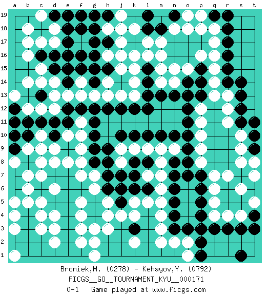 Last move : 0-1 2017 November 21 5:38:45 [Event "FICGS__GO__TOURNAMENT_KYU__000171"] [Site "FICGS"] [Date "2016.11.22"] [Round "1"] [Black "Broniek,Mariusz Maciej"] [White "Kehayov,Yulian"] [Result "0-1"] [Rating 1 "0278"] [Rating 2 "0792"] 1.r16 d4 2.d16 q4 3.p5 k16 4.p4 q5 5.q3 r4 6.r3 s4 7.s3 q6 8.p6 q7 9.p7 p8 10.o8 p9 11.o9 p10 12.o10 p11 13.o11 p12 14.o12 q15 15.r15 q14 16.r14 r13 17.s13 r12 18.s12 r11 19.s11 s10 20.t10 s9 21.t9 t8 22.t11 s8 23.s14 q16 24.r17 q17 25.r18 q18 26.q19 p18 27.r19 e8 28.t4 t5 29.t3 s6 30.p13 q13 31.o13 h3 32.p14 p19 33.p15 d14 34.n19 n18 35.m18 m17 36.n17 o18 37.o17 l17 38.p17 p16 39.o16 o15 40.n16 n15 41.m16 m15 42.s7 r7 43.l19 k18 44.o7 k4 45.l15 l16 46.l14 k14 47.l13 k13 48.k12 j13 49.j12 h13 50.h12 g13 51.g12 f13 52.f12 e13 53.e12 d12 54.d11 c12 55.c11 b12 56.b11 c17 57.c16 d17 58.e17 d18 59.e18 b16 60.e16 c15 61.d15 b14 62.k10 g6 63.k7 c8 64.e6 f7 65.d7 d8 66.e7 f8 67.f6 f5 68.e5 f4 69.g5 h5 70.g4 g3 71.e4 f3 72.e3 d3 73.e2 d2 74.d1 c7 75.d5 c5 76.c6 b6 77.h6 g7 78.c2 c3 79.b2 c4 80.f1 g2 81.b3 b5 82.b4 a1 83.a2 a4 84.b1 f2 85.c1 g1 86.e1 d6 87.j5 h4 88.c6 b7 89.g16 g15 90.d19 b17 91.h15 k15 92.g14 f14 93.f15 h14 94.g15 f17 95.f18 g17 96.h17 j16 97.g18 h16 98.f16 g19 99.h19 j18 100.h7 j4 101.k6 k5 102.j6 l5 103.a12 a13 104.a11 m3 105.n3 m4 106.n4 m6 107.f19 c19 108.e19 h18 109.p3 n2 110.o3 o2 111.p2 o1 112.p1 m2 113.g8 f9 114.g9 f10 115.g10 f11 116.e11 e10 117.d10 d9 118.c9 b9 119.c13 c14 120.e15 a5 121.g11 m7 122.n5 m5 123.n6 m8 124.l12 m9 125.m10 l9 126.l10 k9 127.j10 j9 128.h9 j8 129.h8 n9 130.n10 l7 131.k8 a3 132.n7 c10 133.b10 c9 134.j7 m14 135.m13 n14 136.n13 pass 137.k3 k2 138.a9 a8 139.a10 b18 140.l8 d6 141.g17 j17 142.c6 t7 143.n8 d6 144.s1 a1 145.o14 m16 146.l18 o19 147.e14 j15 148.g19 j19 149.l6 d13 0-1 Here are the names of the openings (joseki) played in the four corners : Corner q4 : q4 p5 Hoshi (Hwajeom, Seongjeom, Xingwei`) 4-4 Point. The star or hoshi (4-4) point, emphasizing influence at the potential expense of territory. Corner q16 : r16 p11 Komoku (Somok, Xiao~mu`) 3-4 Point. The komoku (3-4) point is the traditional corner enclosure move.. Corner d16 : d16 d14 Hoshi (Hwajeom, Seongjeom, Xingwei`) 4-4 Point. The star or hoshi (4-4) point, emphasizing influence at the potential expense of territory. Ikken Takagakari (Hankan Nop'dakeolch'im, Yi Gaojia, 1-Space High Approach). Black typically responds at 6-4 or 3-10. Black 4-10 is played when Black finds play on the right side advantageous. Black 4-8 or 3-8 may be played when Black has support at top. Player White won this Go (weiqi, baduk) game. Follow this game move after move (download)Good moves and bad moves are bedfellows. (Anonymous) Who needs drugs and alcohol if he can play Big Chess at FICGS ? (Heinz-Georg Lehnhoff)