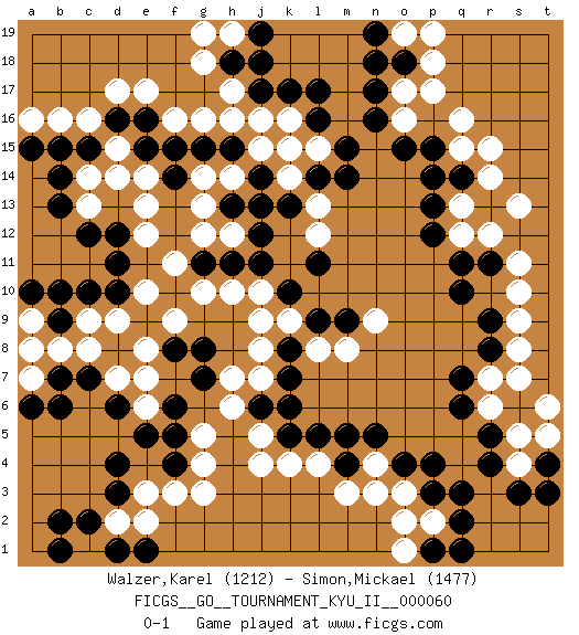 Last move : 0-1 2017 January 31 22:30:47 [Event "FICGS__GO__TOURNAMENT_KYU_II__000060"] [Site "FICGS"] [Date "2016.11.25"] [Round "1"] [Black "Walzer,Karel"] [White "Simon,Mickael"] [Result "0-1"] [Rating 1 "1212"] [Rating 2 "1477"] 1.d4 q16 2.q3 c16 3.r5 k4 4.d16 d17 5.e16 e17 6.c15 b16 7.b15 f16 8.f15 g16 9.g15 h16 10.d10 f3 11.f4 g4 12.f5 e3 13.d3 o3 14.q14 o17 15.q10 r14 16.r13 r15 17.l16 d15 18.e15 d14 19.b13 e12 20.d12 e13 21.h15 j15 22.h13 g13 23.j14 k15 24.n16 h12 25.j12 g12 26.j11 h10 27.h11 f9 28.g11 f11 29.c7 g10 30.j17 j16 31.k17 k9 32.l11 q13 33.p13 q12 34.p12 r12 35.p15 r7 36.q7 r6 37.q6 s5 38.r4 s4 39.s3 s10 40.m4 m3 41.o4 n4 42.n5 n3 43.l5 n9 44.l9 l8 45.m9 m8 46.k8 j9 47.k7 e10 48.r8 d9 49.c10 c9 50.b9 b8 51.b10 c8 52.b7 a7 53.a6 a8 54.b6 s8 55.r9 s9 56.n17 g18 57.o18 c14 58.b14 p17 59.l14 a9 60.a10 d7 61.d6 e7 62.a15 a16 63.d11 p18 64.n19 d2 65.c2 g3 66.p4 c13 67.c12 p2 68.q2 l4 69.m5 e2 70.g7 c1 71.b2 h6 72.f6 h7 73.k5 j5 74.g8 j8 75.j6 g5 76.k10 l15 77.m15 k14 78.k13 e14 79.f14 h14 80.j13 g14 81.h18 h17 82.j18 p19 83.r11 s11 84.q11 s13 85.s6 s7 86.t4 t6 87.p3 o1 88.f8 e8 89.b1 h19 90.j19 g19 91.q1 j4 92.p1 o2 93.d1 o19 94.n18 o16 95.o15 j7 96.k6 q15 97.p14 e6 98.e5 k16 99.l17 t5 100.t3 j10 101.e1 l13 102.m14 l12 0-1 Here are the names of the openings (joseki) played in the four corners : Corner d16 : c16 d16 Komoku (Somok, Xiao~mu`) 3-4 Point. The komoku (3-4) point is the traditional corner enclosure move.. Corner d4 : d4 f3 Hoshi (Hwajeom, Seongjeom, Xingwei`) 4-4 Point. The star or hoshi (4-4) point, emphasizing influence at the potential expense of territory. Ikken Kakari (Hankan Keolch'im, Yi Gua`jiao~, 1-Space Low Approach). White 2 is the standard approach move to the 4-4. Corner q16 : q16 q14 Hoshi (Hwajeom, Seongjeom, Xingwei`) 4-4 Point. The star or hoshi (4-4) point, emphasizing influence at the potential expense of territory. Ikken Takagakari (Hankan Nop'dakeolch'im, Yi Gaojia, 1-Space High Approach). White typically responds at 6-4 or 3-10. White 4-10 is played when White finds play on the right side advantageous. White 4-8 or 3-8 may be played when White has support at top. Player White won this Go (weiqi, baduk) game. Follow this game move after move (download)If you lose by one point, take a rest. (Anonymous) I teach you to lie, cheat and steal, and as soon as my back's turned you wait in line ? (Gregory House, House M.D.)