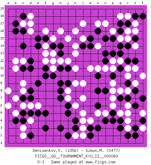 Last move : 0-1 2017 February 17 23:42:24 [Event "FICGS__GO__TOURNAMENT_KYU_II__000060"] [Site "FICGS"] [Date "2016.11.25"] [Round "1"] [Black "Denisenkov,Valentin"] [White "Simon,Mickael"] [Result "0-1"] [Rating 1 "1356"] [Rating 2 "1477"] 1.q16 d4 2.q3 d16 3.f3 c6 4.d2 c3 5.k4 q5 6.o4 r3 7.r2 r4 8.r7 p6 9.s2 q8 10.r9 o17 11.r14 q18 12.r17 l17 13.c14 c12 14.e14 f16 15.b16 c17 16.d11 c9 17.c11 p9 18.q11 r8 19.s8 s7 20.s6 s9 21.t7 r10 22.t4 s11 23.f5 m4 24.m3 l3 25.n3 l4 26.k3 l2 27.m2 k2 28.h3 c2 29.j2 l7 30.j6 o11 31.n6 l5 32.n8 l9 33.n10 n5 34.q4 r5 35.p5 o5 36.p4 p7 37.o8 m11 38.e9 p12 39.q7 p8 40.p10 q12 41.r12 r11 42.s12 t10 43.h14 h16 44.j9 k11 45.j11 r6 46.b17 r18 47.s18 j12 48.h11 t3 49.s3 t5 50.k15 k16 51.o15 k13 52.n16 b11 53.d12 n17 54.o13 n11 55.d8 c8 56.d7 b12 57.c18 d18 58.c16 d17 59.c7 b7 60.b6 a8 61.c5 d6 62.d5 e6 63.e5 b5 64.b4 a6 65.c4 l15 66.l14 k14 67.m15 j15 68.m14 g13 69.h13 h12 70.g12 f13 71.g14 f14 72.f15 g15 73.e15 f12 74.f11 g11 75.g10 g12 76.f10 j8 77.h8 j7 78.h7 k6 79.j5 k9 80.h9 s16 81.s15 s17 82.t18 r16 83.q17 q15 84.p15 r15 85.q14 p16 86.p13 s14 87.q13 n14 88.o12 p11 0-1 Here are the names of the openings (joseki) played in the four corners : Corner d4 : d4 f3 Hoshi (Hwajeom, Seongjeom, Xingwei`) 4-4 Point. The star or hoshi (4-4) point, emphasizing influence at the potential expense of territory. Ikken Kakari (Hankan Keolch'im, Yi Gua`jiao~, 1-Space Low Approach). Black 2 is the standard approach move to the 4-4. Corner q4 : q3 q5 Komoku (Somok, Xiao~mu`) 3-4 Point. The komoku (3-4) point is the traditional corner enclosure move.. Ikken Takagakari (Hankan Nop'dakeolch'im, Yi Gaogua`jiao~, 1-Space High Approach). The 5-4 approach move has become more popular in modern times, as modern Go emphasizes speed and influence. Corner q16 : q16 o17 Hoshi (Hwajeom, Seongjeom, Xingwei`) 4-4 Point. The star or hoshi (4-4) point, emphasizing influence at the potential expense of territory. Ikken Kakari (Hankan Keolch'im, Yi Gua`jiao~, 1-Space Low Approach). White 2 is the standard approach move to the 4-4. Corner d16 : d16 c14 Hoshi (Hwajeom, Seongjeom, Xingwei`) 4-4 Point. The star or hoshi (4-4) point, emphasizing influence at the potential expense of territory. Ikken Kakari (Hankan Keolch'im, Yi Gua`jiao~, 1-Space Low Approach). Black 2 is the standard approach move to the 4-4. Player White won this Go (weiqi, baduk) game. Follow this game move after move (download)White is always trying to kill a bigger group than black is trying to save. (Anonymous) Heh, heh, heh. Time to abandon ship. (General Grievous in Star Wars ep.3)