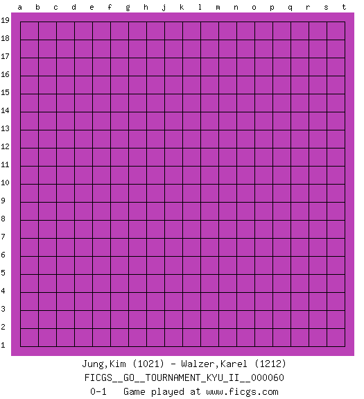 Last move : 0-1 2016 December 25 21:19:6 [Event "FICGS__GO__TOURNAMENT_KYU_II__000060"] [Site "FICGS"] [Date "2016.11.25"] [Round "1"] [Black "Jung,Kim"] [White "Walzer,Karel"] [Result "0-1"] [Rating 1 "1021"] [Rating 2 "1212"] 0-1 This go game has been lost on time (started : 2016.11.25 15:7:57) Here are the names of the openings (joseki) played in the four corners : Player White won this Go (weiqi, baduk) game. Follow this game move after move (download)A few moments to learn, a lifetime to master. (Ancient proverb) Creativity is allowing yourself to make mistakes. Art is knowing which ones to keep. (Scott Adams)