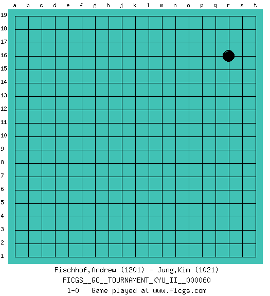 Last move : 1-0 2016 December 26 21:19:34 [Event "FICGS__GO__TOURNAMENT_KYU_II__000060"] [Site "FICGS"] [Date "2016.11.25"] [Round "1"] [Black "Fischhof,Andrew"] [White "Jung,Kim"] [Result "1-0"] [Rating 1 "1201"] [Rating 2 "1021"] 1.r16 1-0 This go game has been lost on time (started : 2016.11.25 15:7:57) Here are the names of the openings (joseki) played in the four corners : Player Black won this Go (weiqi, baduk) game. Follow this game move after move (download)Play slow, win slow; play fast, lose fast. (Anonymous) Don't anthropomorphize computers - they hate it. (Anonymous)