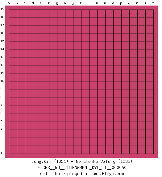 Last move : 0-1 2016 December 25 21:19:6 [Event "FICGS__GO__TOURNAMENT_KYU_II__000060"] [Site "FICGS"] [Date "2016.11.25"] [Round "1"] [Black "Jung,Kim"] [White "Nemchenko,Valery"] [Result "0-1"] [Rating 1 "1021"] [Rating 2 "1335"] 0-1 This go game has been lost on time (started : 2016.11.25 15:7:57) Here are the names of the openings (joseki) played in the four corners : Player White won this Go (weiqi, baduk) game. Follow this game move after move (download)With only one group, you will win. (Anonymous) Yoga is 99% practice and 1% knowledge. (Sri Krishna Pattabhi Jois)
