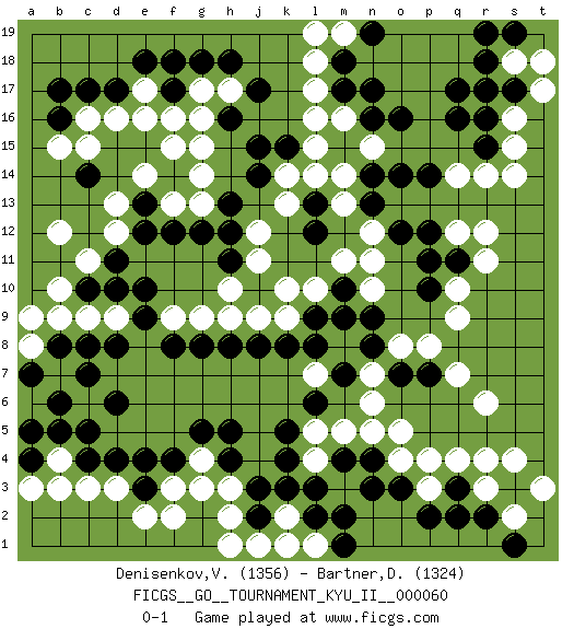Last move : 0-1 2017 February 23 22:29:16 [Event "FICGS__GO__TOURNAMENT_KYU_II__000060"] [Site "FICGS"] [Date "2016.11.25"] [Round "1"] [Black "Denisenkov,Valentin"] [White "Bartner,Douglas"] [Result "0-1"] [Rating 1 "1356"] [Rating 2 "1324"] 1.q16 q4 2.d4 d16 3.o3 r6 4.q2 r3 5.k4 q10 6.c14 d12 7.c17 c16 8.d17 e16 9.b16 b15 10.b17 c15 11.f17 g15 12.j17 r14 13.r15 q14 14.o16 m16 15.m17 l17 16.n17 l16 17.j15 m14 18.o14 k14 19.j14 k13 20.h12 g13 21.h13 n12 22.p12 r12 23.n13 m13 24.o12 n11 25.p10 q9 26.q11 r11 27.n9 c6 28.d8 c3 29.c4 d3 30.e4 b4 31.b5 b3 32.c5 f3 33.f4 g3 34.h4 c9 35.c8 d9 36.e9 b9 37.e10 b7 38.b8 a8 39.d6 k10 40.k8 j9 41.j8 h9 42.h8 o5 43.e13 d13 44.f12 m5 45.m4 l5 46.k5 l4 47.l3 m3 48.n4 n5 49.k3 g4 50.g5 h3 51.h5 o4 52.n3 r17 53.q17 s15 54.r16 s16 55.s17 e14 56.f14 e17 57.e18 f16 58.f18 f13 59.e12 f15 60.g12 g14 61.d11 c11 62.o7 p8 63.p7 q7 64.r2 l7 65.l9 l10 66.m10 m11 67.l12 j12 68.h11 j11 69.k15 l15 70.l13 k9 71.l8 h10 72.c7 o8 73.n8 n7 74.m7 n6 75.l6 s18 76.r18 t17 77.c10 b10 78.d10 b12 79.e3 e2 80.j3 h2 81.s3 s4 82.q3 r4 83.b6 g9 84.g8 f9 85.f8 l18 86.m18 l1 87.m2 g17 88.g18 h17 89.h18 s2 90.k1 k2 91.l2 j1 92.j2 k1 93.m1 h1 94.a4 f2 95.h16 g16 96.p14 q12 97.p11 m19 98.n19 l19 99.n16 a3 100.a5 n15 101.n14 n10 102.m9 l14 103.r17 p3 104.p2 p4 105.s19 t18 106.r19 s14 107.s1 t3 108.a7 a9 0-1 Here are the names of the openings (joseki) played in the four corners : Corner q4 : q4 o3 Hoshi (Hwajeom, Seongjeom, Xingwei`) 4-4 Point. The star or hoshi (4-4) point, emphasizing influence at the potential expense of territory. Ikken Kakari (Hankan Keolch'im, Yi Gua`jiao~, 1-Space Low Approach). Black 2 is the standard approach move to the 4-4. Corner d16 : d16 c14 Hoshi (Hwajeom, Seongjeom, Xingwei`) 4-4 Point. The star or hoshi (4-4) point, emphasizing influence at the potential expense of territory. Ikken Kakari (Hankan Keolch'im, Yi Gua`jiao~, 1-Space Low Approach). Black 2 is the standard approach move to the 4-4. Corner q16 : q16 r14 Hoshi (Hwajeom, Seongjeom, Xingwei`) 4-4 Point. The star or hoshi (4-4) point, emphasizing influence at the potential expense of territory. Ikken Kakari (Hankan Keolch'im, Yi Gua`jiao~, 1-Space Low Approach). White 2 is the standard approach move to the 4-4. Corner d4 : d4 c6 Hoshi (Hwajeom, Seongjeom, Xingwei`) 4-4 Point. The star or hoshi (4-4) point, emphasizing influence at the potential expense of territory. Ikken Kakari (Hankan Keolch'im, Yi Gua`jiao~, 1-Space Low Approach). White 2 is the standard approach move to the 4-4. Player White won this Go (weiqi, baduk) game. Follow this game move after move (download)Don't reduce your own liberties. (Bill Taylor) Don't be irreplaceable, if you can't be replaced, you can't be promoted. (Dan Rotaru)