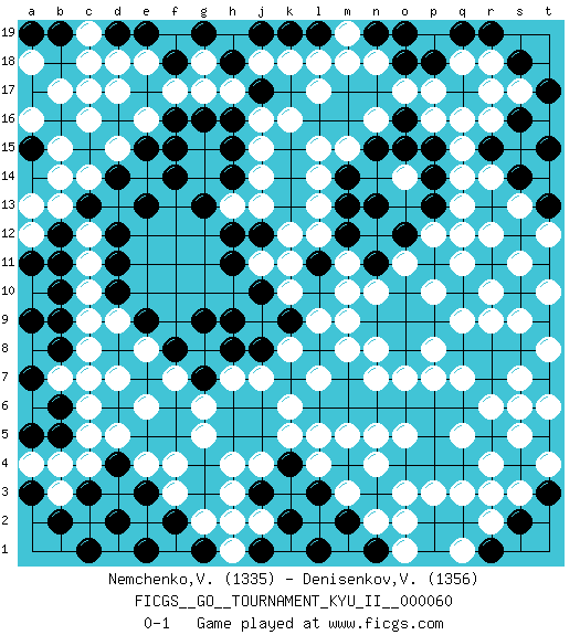 Last move : 0-1 2017 April 26 15:1:53 [Event "FICGS__GO__TOURNAMENT_KYU_II__000060"] [Site "FICGS"] [Date "2016.11.25"] [Round "1"] [Black "Nemchenko,Valery"] [White "Denisenkov,Valentin"] [Result "0-1"] [Rating 1 "1335"] [Rating 2 "1356"] 1.d16 r4 2.d4 q16 3.p14 r14 4.p15 p16 5.o16 o17 6.n17 n16 7.o15 n18 8.m17 m18 9.m16 l18 10.n15 f17 11.f15 d18 12.e17 e18 13.e15 c17 14.f16 g17 15.g16 f3 16.e3 f4 17.f5 g5 18.e5 g6 19.f6 c11 20.d12 c8 21.e7 c14 22.d14 c12 23.c13 b13 24.e13 b14 25.c15 b15 26.b16 c16 27.a15 b17 28.a17 a18 29.b18 a16 30.b19 p3 31.o4 o3 32.p4 n4 33.p5 r6 34.q6 q7 35.p6 p7 36.o6 n5 37.n6 l5 38.m6 k6 39.l6 k5 40.k7 q12 41.p13 n8 42.o8 o7 43.o9 n7 44.o10 j11 45.h11 j13 46.h12 j16 47.h15 j15 48.h14 j14 49.h16 h17 50.j17 j18 51.k17 l17 52.l16 k16 53.k15 l15 54.k14 l14 55.k13 l12 56.j12 k18 57.m14 k12 58.m13 l13 59.m12 m15 60.n13 n16 61.c18 c6 62.d6 c5 63.g4 h4 64.g3 g2 65.f2 h3 66.g1 h1 67.e1 e4 68.d2 b3 69.c3 d5 70.c7 f7 71.g7 e6 72.d8 b7 73.f8 d7 74.e9 d9 75.d10 e8 76.g9 h7 77.h8 j7 78.j8 k10 79.l11 k11 80.j10 k8 81.k9 l7 82.m7 m8 83.n9 l9 84.h9 m11 85.n11 m10 86.o12 q9 87.q10 r10 88.p11 q11 89.p9 r9 90.d19 d17 91.d11 c10 92.f18 e16 93.f14 d15 94.e19 h13 95.g13 p12 96.r5 s5 97.q4 q3 98.m4 m5 99.n3 o5 100.l3 n2 101.m2 o2 102.n1 o1 103.l1 l4 104.k2 m3 105.k4 j4 106.j3 j2 107.j1 h2 108.b2 b4 109.c1 c4 110.a3 a4 111.r3 q5 112.q2 r2 113.s2 s3 114.r1 r3 115.p1 n10 116.t3 m9 117.t5 t6 118.t7 t4 119.s8 s7 120.t9 pass 121.s10 s11 122.t11 s9 123.s12 t10 124.t13 t12 125.r13 q13 126.s14 q14 127.r15 q15 128.s16 r17 129.t15 s17 130.t17 r12 131.s18 r18 132.r19 q18 133.g19 g18 134.h18 p8 135.b9 p10 136.b10 o11 137.b11 c9 138.b8 r16 139.a7 pass 140.b12 a12 141.a11 a13 142.j19 pass 143.b6 c7 144.a5 o14 145.p18 pass 146.o19 pass 147.q19 s13 148.b5 a6 149.a9 pass 150.o18 pass 151.k19 pass 152.n19 p17 153.b5 d3 154.a5 pass 155.b6 pass 156.p2 q1 157.l19 m19 158.a19 c19 159.j17 pass 160.r8 pass 161.b19 c18 162.r7 s6 163.q8 t8 164.a19 pass 165.pass pass 166.d4 pass 167.pass pass 0-1 Here are the names of the openings (joseki) played in the four corners : Corner q16 : q16 p14 Hoshi (Hwajeom, Seongjeom, Xingwei`) 4-4 Point. The star or hoshi (4-4) point, emphasizing influence at the potential expense of territory. Corner d16 : d16 f17 Hoshi (Hwajeom, Seongjeom, Xingwei`) 4-4 Point. The star or hoshi (4-4) point, emphasizing influence at the potential expense of territory. Ikken Kakari (Hankan Keolch'im, Yi Gua`jiao~, 1-Space Low Approach). White 2 is the standard approach move to the 4-4. Corner d4 : d4 f3 Hoshi (Hwajeom, Seongjeom, Xingwei`) 4-4 Point. The star or hoshi (4-4) point, emphasizing influence at the potential expense of territory. Ikken Kakari (Hankan Keolch'im, Yi Gua`jiao~, 1-Space Low Approach). White 2 is the standard approach move to the 4-4. Player White won this Go (weiqi, baduk) game. Follow this game move after move (download)You have to like to win, and to learn to recognize the errors that gave you the victory. (Pierre Audouard) 'preceded by its own quotation yields a falsehood' preceded by its own quotation yields a falsehood. (W. V. O. Quine - Set Theory And Its Logic, 1953)