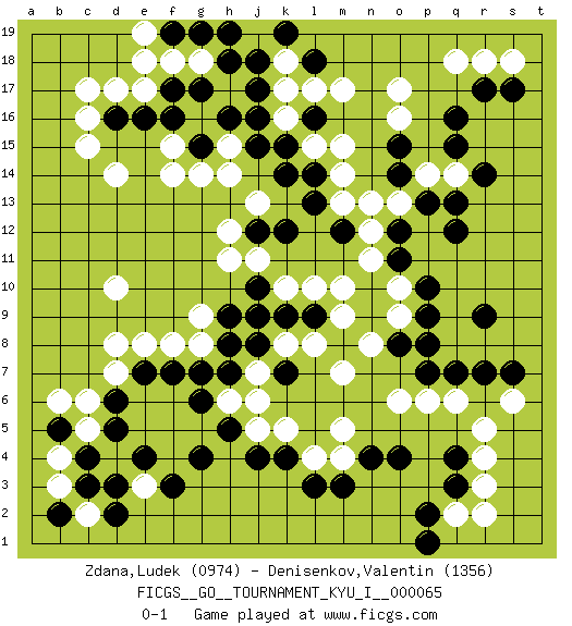 Last move : 0-1 2017 March 10 22:26:19 [Event "FICGS__GO__TOURNAMENT_KYU_I__000065"] [Site "FICGS"] [Date "2016.11.25"] [Round "1"] [Black "Zdana,Ludek"] [White "Denisenkov,Valentin"] [Result "0-1"] [Rating 1 "0974"] [Rating 2 "1356"] 1.q16 c16 2.q3 o17 3.r9 d4 4.k4 q18 5.r17 k16 6.e16 e17 7.f17 d17 8.j17 k17 9.j16 f18 10.g17 d14 11.q12 f14 12.g15 d10 13.f3 e3 14.g4 r5 15.o4 r3 16.q4 r4 17.r7 q6 18.q7 o6 19.o8 g14 20.k15 l15 21.k14 f15 22.f16 h15 23.h16 h14 24.j15 g18 25.h18 k18 26.j18 m13 27.l14 m14 28.l16 m15 29.k12 h11 30.b5 c5 31.c3 c2 32.c4 c6 33.d3 b6 34.e4 b4 35.d5 b3 36.d2 p14 37.q15 q14 38.r14 m10 39.o11 n11 40.o12 k10 41.d16 c15 42.g19 e18 43.k19 l17 44.l18 m17 45.l13 j13 46.m12 n12 47.f19 e19 48.h19 c17 49.d6 d7 50.e7 d8 51.b2 e8 52.f7 f8 53.g7 m5 54.m3 m7 55.k7 l4 56.l3 k5 57.j4 j5 58.h5 j7 59.j8 h6 60.g6 k8 61.h7 j6 62.h9 g9 63.k9 l8 64.l9 m9 65.j10 l10 66.j9 j11 67.j12 h12 68.p7 p6 69.q13 r18 70.s17 s6 71.s7 o10 72.p10 o9 73.p9 n8 74.p8 q2 75.p2 r2 76.p1 m4 77.n4 g8 78.h8 s18 79.o14 o13 80.p13 n13 81.o15 o16 0-1 Here are the names of the openings (joseki) played in the four corners : Corner q16 : q16 o17 Hoshi (Hwajeom, Seongjeom, Xingwei`) 4-4 Point. The star or hoshi (4-4) point, emphasizing influence at the potential expense of territory. Ikken Kakari (Hankan Keolch'im, Yi Gua`jiao~, 1-Space Low Approach). White 2 is the standard approach move to the 4-4. Corner d16 : c16 e16 Komoku (Somok, Xiao~mu`) 3-4 Point. The komoku (3-4) point is the traditional corner enclosure move.. Ikken Takagakari (Hankan Nop'dakeolch'im, Yi Gaogua`jiao~, 1-Space High Approach). The 5-4 approach move has become more popular in modern times, as modern Go emphasizes speed and influence. Corner d4 : d4 f3 Hoshi (Hwajeom, Seongjeom, Xingwei`) 4-4 Point. The star or hoshi (4-4) point, emphasizing influence at the potential expense of territory. Ikken Kakari (Hankan Keolch'im, Yi Gua`jiao~, 1-Space Low Approach). Black 2 is the standard approach move to the 4-4. Player White won this Go (weiqi, baduk) game. Follow this game move after move (download)Do not fear furikawari. (Anonymous) I'll be back. (Arnold Schwarzenegger)