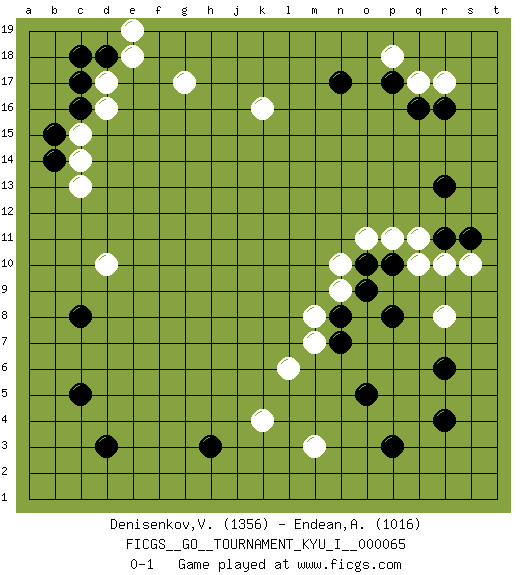 Last move : 0-1 2017 February 12 15:15:58 [Event "FICGS__GO__TOURNAMENT_KYU_I__000065"] [Site "FICGS"] [Date "2016.11.25"] [Round "1"] [Black "Denisenkov,Valentin"] [White "Endean,Andrew"] [Result "0-1"] [Rating 1 "1356"] [Rating 2 "1016"] 1.q16 d16 2.d3 k16 3.r4 d10 4.c5 k4 5.p3 q10 6.c17 d17 7.c16 c15 8.b15 c14 9.b14 c13 10.d18 e18 11.c18 e19 12.r13 r8 13.n17 g17 14.h3 m3 15.o5 l6 16.n7 m8 17.n8 m7 18.r11 r10 19.r6 n9 20.o9 n10 21.o10 o11 22.p10 p11 23.p8 q11 24.s11 s10 25.c8 r17 26.r16 q17 27.p17 p18 0-1 This go game has been lost on time (started : 2016.11.25 15:8:48) Here are the names of the openings (joseki) played in the four corners : Corner d16 : d16 c17 Hoshi (Hwajeom, Seongjeom, Xingwei`) 4-4 Point. The star or hoshi (4-4) point, emphasizing influence at the potential expense of territory. Player White won this Go (weiqi, baduk) game. Follow this game move after move (download)Strike at the waist of the knight's move. (Anonymous) You must have a dream in order to have it come true. (A.P.J. Kalam)
