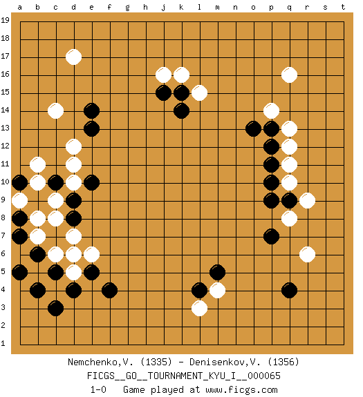 Last move : 1-0 2017 February 14 3:29:48 [Event "FICGS__GO__TOURNAMENT_KYU_I__000065"] [Site "FICGS"] [Date "2016.11.25"] [Round "1"] [Black "Nemchenko,Valery"] [White "Denisenkov,Valentin"] [Result "1-0"] [Rating 1 "1335"] [Rating 2 "1356"] 1.q4 d17 2.d4 c6 3.d6 d7 4.c5 e6 5.e5 d5 6.b4 d6 7.c3 q16 8.f4 r6 9.p7 r9 10.q9 q10 11.p10 q8 12.p9 q11 13.p11 q12 14.p12 q13 15.p13 p14 16.o13 k16 17.j15 j16 18.k15 l15 19.k14 d12 20.e14 c14 21.d8 c8 22.d9 c9 23.c10 d10 24.e10 d11 25.b9 b8 26.a10 b11 27.a8 b7 28.b6 a6 29.a5 b10 30.a7 a9 31.e13 l3 32.l4 m4 33.m5 1-0 This go game has been lost on time (started : 2016.11.25 15:8:48) Here are the names of the openings (joseki) played in the four corners : Corner d4 : d4 c6 Hoshi (Hwajeom, Seongjeom, Xingwei`) 4-4 Point. The star or hoshi (4-4) point, emphasizing influence at the potential expense of territory. Ikken Kakari (Hankan Keolch'im, Yi Gua`jiao~, 1-Space Low Approach). White 2 is the standard approach move to the 4-4. Corner q4 : q4 r6 Hoshi (Hwajeom, Seongjeom, Xingwei`) 4-4 Point. The star or hoshi (4-4) point, emphasizing influence at the potential expense of territory. Ikken Kakari (Hankan Keolch'im, Yi Gua`jiao~, 1-Space Low Approach). White 2 is the standard approach move to the 4-4. Corner d16 : d17 j15 Komoku (Somok, Xiao~mu`) 3-4 Point. The komoku (3-4) point is the traditional corner enclosure move.. Player Black won this Go (weiqi, baduk) game. Follow this game move after move (download)Territory is a closed space where time no longer exists. The transformation around it slower alter it, and sometimes it cracks open like a rotten egg at the least shock. (Pierre Audouard) Strategy without tactics is the slowest route to victory. Tactics without strategy is the noise before defeat. (Sun Tzu)
