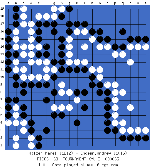 Last move : 1-0 2017 April 21 19:25:42 [Event "FICGS__GO__TOURNAMENT_KYU_I__000065"] [Site "FICGS"] [Date "2016.11.25"] [Round "1"] [Black "Walzer,Karel"] [White "Endean,Andrew"] [Result "1-0"] [Rating 1 "1212"] [Rating 2 "1016"] 1.d4 d16 2.q16 q4 3.o3 r6 4.o5 q8 5.k4 r14 6.q14 q13 7.p14 p13 8.r15 s14 9.s15 t14 10.m16 d10 11.f17 c14 12.c8 c3 13.d3 c4 14.c5 b5 15.c6 b6 16.b7 d2 17.e2 d1 18.e1 b2 19.f3 h17 20.g16 h16 21.f14 d12 22.h15 j15 23.h14 j14 24.h12 k12 25.k11 l12 26.l11 m11 27.m10 n11 28.f9 e18 29.e17 d17 30.k17 l14 31.n8 o9 32.o8 p9 33.j16 k16 34.j17 l16 35.l17 m15 36.n15 n14 37.o15 o14 38.n16 n10 39.m9 j13 40.h13 j12 41.j11 f18 42.h18 g18 43.g17 f11 44.g10 g11 45.h11 f10 46.e9 e10 47.b10 c11 48.q2 r3 49.r2 s3 50.a13 b14 51.a14 b15 52.a15 b16 53.a16 b12 54.a12 b11 55.a11 p6 56.c9 c10 57.b9 e14 58.e15 d15 59.e13 d14 60.f13 e12 61.o6 p5 62.t15 r12 63.s2 t3 64.t2 p7 65.p3 q3 66.a6 b4 67.b17 c17 68.b18 c18 69.b19 c19 70.o7 p8 71.d9 j6 72.h5 h6 73.g5 g6 74.f7 p4 75.o4 h19 76.j19 g19 77.e16 d13 78.b13 c13 79.g12 f12 80.a5 a4 81.a7 b1 82.n9 h9 83.g8 h8 84.k8 k7 85.l6 j8 86.l8 pass 87.pass pass 88.pass 1-0 Here are the names of the openings (joseki) played in the four corners : Corner q4 : q4 o3 Hoshi (Hwajeom, Seongjeom, Xingwei`) 4-4 Point. The star or hoshi (4-4) point, emphasizing influence at the potential expense of territory. Ikken Kakari (Hankan Keolch'im, Yi Gua`jiao~, 1-Space Low Approach). Black 2 is the standard approach move to the 4-4. Corner q16 : q16 r14 Hoshi (Hwajeom, Seongjeom, Xingwei`) 4-4 Point. The star or hoshi (4-4) point, emphasizing influence at the potential expense of territory. Ikken Kakari (Hankan Keolch'im, Yi Gua`jiao~, 1-Space Low Approach). White 2 is the standard approach move to the 4-4. Corner d16 : d16 f17 Hoshi (Hwajeom, Seongjeom, Xingwei`) 4-4 Point. The star or hoshi (4-4) point, emphasizing influence at the potential expense of territory. Ikken Kakari (Hankan Keolch'im, Yi Gua`jiao~, 1-Space Low Approach). Black 2 is the standard approach move to the 4-4. Player Black won this Go (weiqi, baduk) game. Follow this game move after move (download)Go is to western chess what philosophy is to double entry accounting. (from Shibumi, by Trevanian) Luck has a peculiar habit of favoring those who don't depend on it. (Author unknown)