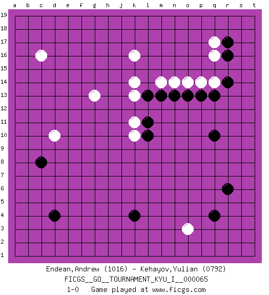 Last move : 1-0 2017 January 26 12:45:27 [Event "FICGS__GO__TOURNAMENT_KYU_I__000065"] [Site "FICGS"] [Date "2016.11.25"] [Round "1"] [Black "Endean,Andrew"] [White "Kehayov,Yulian"] [Result "1-0"] [Rating 1 "1016"] [Rating 2 "0792"] 1.q4 q16 2.d4 c16 3.k4 k16 4.q10 d10 5.r14 k10 6.c8 g13 7.r17 q17 8.r16 q14 9.q13 p14 10.p13 o14 11.o13 n14 12.n13 m14 13.m13 k14 14.l13 k13 15.l11 k11 16.l10 o3 17.r6 1-0 This go game has been lost on time (started : 2016.11.25 15:8:48) Here are the names of the openings (joseki) played in the four corners : Corner q16 : q16 r14 Hoshi (Hwajeom, Seongjeom, Xingwei`) 4-4 Point. The star or hoshi (4-4) point, emphasizing influence at the potential expense of territory. Ikken Kakari (Hankan Keolch'im, Yi Gua`jiao~, 1-Space Low Approach). Black 2 is the standard approach move to the 4-4. Corner q4 : q4 o3 Hoshi (Hwajeom, Seongjeom, Xingwei`) 4-4 Point. The star or hoshi (4-4) point, emphasizing influence at the potential expense of territory. Ikken Kakari (Hankan Keolch'im, Yi Gua`jiao~, 1-Space Low Approach). White 2 is the standard approach move to the 4-4. Player Black won this Go (weiqi, baduk) game. Follow this game move after move (download)The monkey jump is worth eight points. (Anonymous) All men can see these tactics whereby I conquer, but what none can see is the strategy out of which victory is evolved. (Sun Tzu)