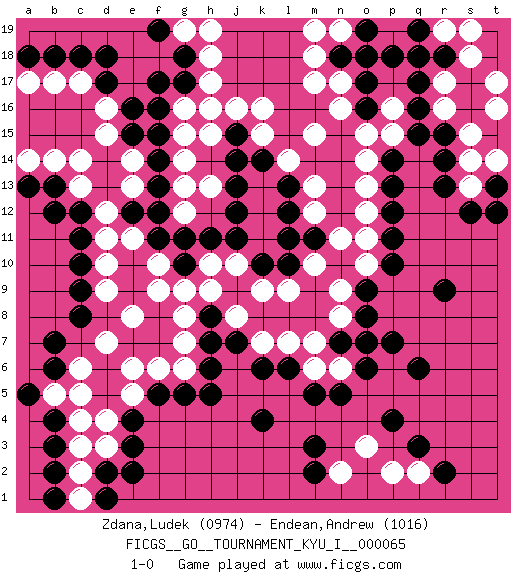 Last move : 1-0 2017 April 20 23:1:58 [Event "FICGS__GO__TOURNAMENT_KYU_I__000065"] [Site "FICGS"] [Date "2016.11.25"] [Round "1"] [Black "Zdana,Ludek"] [White "Endean,Andrew"] [Result "1-0"] [Rating 1 "0974"] [Rating 2 "1016"] 1.q16 d4 2.q3 d16 3.r9 d10 4.k4 k16 5.f17 c14 6.f15 h17 7.d18 c17 8.g18 h18 9.g17 g16 10.f16 g15 11.d17 d15 12.e16 e14 13.f14 g14 14.f13 e13 15.f11 e11 16.e12 d12 17.f12 f10 18.h11 g13 19.j12 j16 20.e3 d3 21.e4 e5 22.f5 e6 23.c8 e8 24.c11 d11 25.c10 d9 26.c9 d7 27.b6 c6 28.b7 b5 29.c12 c13 30.b13 b14 31.b12 h9 32.g10 f9 33.c18 b17 34.b18 a17 35.a18 a14 36.a13 g9 37.h5 r17 38.q17 r16 39.r15 s15 40.r14 s14 41.r13 s13 42.r18 s18 43.q18 s19 44.q6 p15 45.q15 n16 46.p14 o15 47.n18 m17 48.o17 m18 49.p18 o14 50.p13 o13 51.p12 o12 52.l12 m15 53.p11 o11 54.p10 o10 55.o9 g12 56.g11 n9 57.o8 n8 58.m11 m10 59.l10 l9 60.s12 t16 61.t13 t14 62.t12 n11 63.k10 k9 64.n5 m6 65.m5 n6 66.o6 o7 67.p7 r19 68.q19 t17 69.n7 m7 70.o7 m12 71.l11 m13 72.l13 l14 73.k14 k15 74.j14 h15 75.j15 n17 76.o16 p16 77.l6 l7 78.k6 k7 79.j7 j8 80.h7 f6 81.g5 g6 82.h6 g7 83.d2 c2 84.e2 n19 85.o18 j10 86.j11 h10 87.b4 c4 88.a5 c5 89.b3 c3 90.b2 c1 91.d1 o3 92.m3 h13 93.j13 g19 94.f19 h19 95.h8 g8 96.o19 m19 97.b1 q2 98.r2 p2 99.p4 h16 100.e15 n2 101.m2 1-0 Here are the names of the openings (joseki) played in the four corners : Corner d16 : d16 f17 Hoshi (Hwajeom, Seongjeom, Xingwei`) 4-4 Point. The star or hoshi (4-4) point, emphasizing influence at the potential expense of territory. Ikken Kakari (Hankan Keolch'im, Yi Gua`jiao~, 1-Space Low Approach). Black 2 is the standard approach move to the 4-4. Corner d4 : d4 e3 Hoshi (Hwajeom, Seongjeom, Xingwei`) 4-4 Point. The star or hoshi (4-4) point, emphasizing influence at the potential expense of territory. Corner q16 : q16 r17 Hoshi (Hwajeom, Seongjeom, Xingwei`) 4-4 Point. The star or hoshi (4-4) point, emphasizing influence at the potential expense of territory. Player Black won this Go (weiqi, baduk) game. Follow this game move after move (download)A basic: Don't push too hard. (Jansteen) 98% of all statistics are made up. (Author unknown)