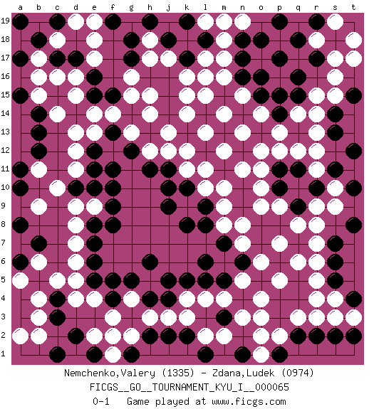 Last move : 0-1 2017 March 18 15:27:58 [Event "FICGS__GO__TOURNAMENT_KYU_I__000065"] [Site "FICGS"] [Date "2016.11.25"] [Round "1"] [Black "Nemchenko,Valery"] [White "Zdana,Ludek"] [Result "0-1"] [Rating 1 "1335"] [Rating 2 "0974"] 1.q16 d4 2.q4 d16 3.f5 d7 4.f8 f3 5.h4 k16 6.m15 m17 7.n16 r13 8.q11 s15 9.r17 p13 10.p14 q14 11.q15 o14 12.p15 r15 13.o16 q12 14.p17 r11 15.p11 r9 16.q18 o9 17.q9 r8 18.r10 s10 19.p10 p12 20.n14 d13 21.n17 m18 22.o18 o11 23.s11 q10 24.o15 p9 25.r10 r12 26.t10 s9 27.p8 q8 28.o8 o10 29.n9 q6 30.p6 r3 31.q5 r6 32.q7 r7 33.o7 p2 34.o5 r5 35.p4 r4 36.o13 g16 37.n12 k14 38.m13 d9 39.d10 c10 40.e10 d11 41.e11 d12 42.e12 e13 43.f13 e14 44.g12 n3 45.n4 o3 46.m5 k12 47.l14 k15 48.k13 j13 49.l12 h12 50.h13 h14 51.g14 h15 52.h11 j12 53.j11 k11 54.k10 l11 55.m11 l10 56.l9 k9 57.j10 m9 58.l8 m8 59.k8 e9 60.f9 h3 61.f4 e4 62.g3 g2 63.g5 j3 64.j5 n8 65.n10 m10 66.n6 n11 67.m7 l4 68.l5 k4 69.k5 m4 70.m3 m2 71.p3 q3 72.j9 o4 73.h6 p5 74.e5 d5 75.e7 d6 76.e8 d8 77.f10 o12 78.t12 s17 79.s18 s16 80.r19 l16 81.p19 f14 82.f15 g15 83.e15 d15 84.e6 g13 85.f11 n7 86.j4 k3 87.c3 e2 88.d2 b2 89.c4 c5 90.b5 b6 91.a4 b3 92.a6 b4 93.a3 a2 94.c1 m12 95.b7 a5 96.a8 b9 97.s13 t18 98.t19 t17 99.s14 r14 100.t15 l13 101.n18 n13 102.m19 l19 103.l18 n19 104.k19 m19 105.k17 l17 106.j18 j17 107.h19 h18 108.g18 h17 109.g17 e18 110.e16 e17 111.f19 e19 112.e1 f1 113.h2 g4 114.a10 b11 115.c17 c16 116.j2 l2 117.k2 n5 118.l6 o6 119.l1 p7 120.g1 f2 121.d17 b17 122.b18 c18 123.c19 d19 124.a19 b16 125.a17 pass 126.s7 pass 127.b13 c14 128.b12 m14 129.s6 o14 130.m13 l15 131.t8 m14 132.o13 m16 133.b14 b15 134.a15 pass 135.s5 s4 136.t4 t3 137.t2 s3 138.s2 n15 139.a11 o14 140.r2 s19 141.q2 r18 142.p1 o1 143.n1 o2 0-1 Here are the names of the openings (joseki) played in the four corners : Corner d4 : d4 f5 Hoshi (Hwajeom, Seongjeom, Xingwei`) 4-4 Point. The star or hoshi (4-4) point, emphasizing influence at the potential expense of territory. Corner q4 : q4 r9 Hoshi (Hwajeom, Seongjeom, Xingwei`) 4-4 Point. The star or hoshi (4-4) point, emphasizing influence at the potential expense of territory. Player White won this Go (weiqi, baduk) game. Follow this game move after move (download)Add one stone, then sacrifice both. (Anonymous) Life is painting a picture, not doing a sum. (Oliver Wendell Holmes, Jr.)