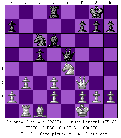 Last move : 1/2-1/2 2017 February 2 10:59:12 [Event "FICGS__CHESS__CLASS_SM__000020"] [Site "FICGS"] [Date "2016.11.25"] [Round "1"] [White "Antonov,Vladimir"] [Black "Kruse,Herbert"] [Result "1/2-1/2"] [WhiteElo "2373"] [BlackElo "2512"] 1.e4 e5 2.Nf3 Nc6 3.Bc4 Nf6 4.Ng5 d5 5.exd5 Na5 6.Bb5+ c6 7.dxc6 bxc6 8.Bd3 Nd5 9.Nf3 Bd6 10.O-O Nf4 11.Re1 Nxd3 12.cxd3 O-O 13.Nxe5 c5 14.Nc3 Re8 15.Nf3 Bg4 16.Rxe8+ Qxe8 17.Ne4 Bxf3 18.Qxf3 Nc6 19.Kf1 Rd8 20.b3 Qe5 21.Rb1 1/2-1/2 Two knights defense Kingside Castling by player White (move 10) Kingside Castling by player Black (move 12) This chess game ended in a draw. Follow this game move after move (download)A thorough understanding of the typical mating continuations makes the most complicated sacrificial combinations leading up to them not only not difficult, but almost a matter of course. (Siegbert Tarrasch) Alle Schachspieler sollten auch ein Hobby haben. (Savielly Grigorievitsch Tartakower) El Ajedrez no es una pizca de inferior al violín, y tenemos un gran número de violinistas profesionales. (Mikhail Botvinnik) Les Echecs, c'est l'art de la guerre sans les charniers, c'est la résurrection des morts tombés au champ d'honneur, l'espoir perpétuel, la suprématie de l'intelligence sur la force, la culture de l'esprit. (F. Szpiner) It's unlucky to be superstitious. (Dave Enteles)