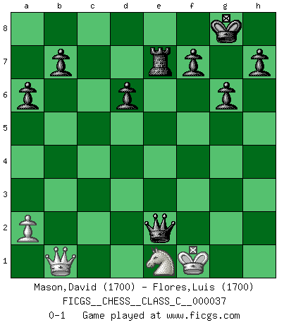 Last move : 0-1 2007 July 8 12:58:47 [Event "FICGS__CHESS__CLASS_C__000037"] [Site "FICGS"] [Date "2007.03.31"] [Round "1"] [White "Mason,David"] [Black "Flores,Luis"] [Result "0-1"] [WhiteElo "1700"] [BlackElo "1700"] 1.e4 c5 2.Nf3 d6 3.d4 cxd4 4.Nxd4 Nf6 5.Nc3 a6 6.Be2 e5 7.Nb3 Be7 8.O-O Be6 9.Bg5 Nbd7 10.Bxf6 Nxf6 11.Nd5 Nxe4 12.Bf3 Ng5 13.Re1 Nxf3+ 14.Qxf3 Rc8 15.Qd3 Bxd5 16.Qxd5 Rxc2 17.Rad1 Qb6 18.Rd2 Rc7 19.h3 O-O 20.Nc1 Bg5 21.R2d1 Qxb2 22.Nd3 Qa3 23.g3 Rfc8 24.f4 Bf6 25.Rd2 exf4 26.gxf4 Bc3 27.Qe4 g6 28.Rc2 Bxe1 29.Rxc7 Rxc7 30.Nxe1 Qg3+ 31.Kf1 Qxh3+ 32.Kf2 Qh4+ 33.Kf1 Re7 34.Qb1 Qxf4+ 35.Kg1 Qe3+ 36.Kf1 Qe2+ 0-1 Sicilian : Najdorf, Opovcensky variation Kingside Castling by player White (move 8) Kingside Castling by player Black (move 19) Player Black won this chess game. Follow this game move after move (download)Without error there can be no brilliancy. (Emanuel Lasker) Es gibt nur zwei wahre Schachgenies - das andere war Wilhelm Steinitz, der Weltmeister von 1872 bis 1894. (Robert James Fischer) Fischer era un maestro de claridad y un Rey del posicionamiento astuto. Sus oponentes podían ver hacia donde se dirigía pero eran impotentes para detenerlo. (Bruce Pandolfini) Horreur, mais aussi harmonie suprême : qu'y avait-il en effet au monde en dehors des échecs ? Le brouillard, l'inconnu, le non-être... (Vladimir Nabokov) When the going gets tactical, the computers get going. (Hyatt)