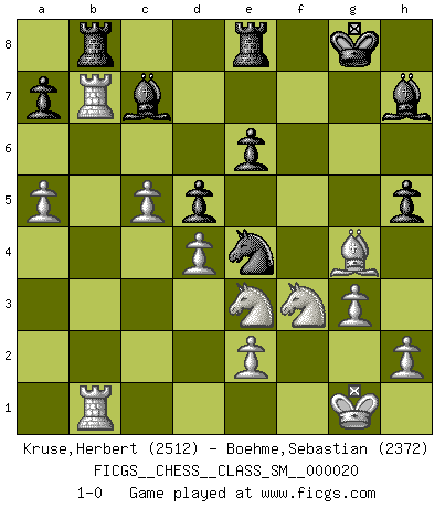 Last move : 1-0 2017 June 22 17:28:43 [Event "FICGS__CHESS__CLASS_SM__000020"] [Site "FICGS"] [Date "2016.11.25"] [Round "1"] [White "Kruse,Herbert"] [Black "Boehme,Sebastian"] [Result "1-0"] [WhiteElo "2512"] [BlackElo "2372"] 1.Nf3 Nf6 2.g3 d5 3.Bg2 c6 4.O-O Bg4 5.d4 Nbd7 6.c4 e6 7.a4 Bb4 8.Bd2 Bd6 9.Bc3 Ne4 10.Nbd2 Nxc3 11.bxc3 Be7 12.Qb3 Qb6 13.Rfb1 Qxb3 14.Rxb3 Rb8 15.a5 Bf5 16.Nf1 O-O 17.Ne3 Be4 18.Nd2 Bg6 19.f4 h6 20.Kf2 Bh7 21.Bh3 Nf6 22.c5 Bd8 23.Nf3 Ne4+ 24.Kg1 Bc7 25.c4 g5 26.cxd5 cxd5 27.f5 Rfe8 28.Rab1 h5 29.Rxb7 g4 30.fxe6 fxe6 31.Bxg4 1-0 Scott Nichols Best game I've seen in years. Reti Opening Kingside Castling by player White (move 4) Kingside Castling by player Black (move 16) Player White won this chess game. Follow this game move after move (download)When asked, -How is that you pick better moves than your opponents?, I responded: I'm very glad you asked me that, because, as it happens, there is a very simple answer. I think up my own moves, and I make my opponent think up his. (Alexander Alekhine) Der Umstand, daß uns eine 7 Stunden Zeitkontrolle ermöglicht eine großartige, tiefe Partie zu spielen, ist für die Massenmedien nicht weiter von Bedeutung. (Alexej Shirov) El Ajedrez es el arte del análisis. (Mikhail Botvinnik) Le joueur d'Echecs qui veut atteindre le top est obligé de développer son propre credo créatif. Alexeï Stepanovicth Souétine. Il est facile d'écrire des livres ! Ce qui est difficile, c'est de jouer ! (Alexeï Stepanovicth Souétine) It's not the size of the dog in the fight, it's the size of the fight in the dog. (Mark Twain)