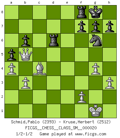 Last move : 1/2-1/2 2017 June 4 11:43:24 [Event "FICGS__CHESS__CLASS_SM__000020"] [Site "FICGS"] [Date "2016.11.25"] [Round "1"] [White "Schmid,Pablo"] [Black "Kruse,Herbert"] [Result "1/2-1/2"] [WhiteElo "2393"] [BlackElo "2512"] 1.e4 e5 2.Nf3 Nc6 3.Bb5 Nf6 4.d3 Bc5 5.c3 O-O 6.O-O d6 7.Nbd2 Ne7 8.d4 exd4 9.cxd4 Bb6 10.Re1 Bg4 11.h3 Bh5 12.Qb3 d5 13.e5 Nd7 14.a4 a5 15.g4 Bg6 16.Nf1 Be4 17.e6 Bxf3 18.exd7 Be4 19.Ng3 c6 20.Nxe4 dxe4 21.Bc4 Bxd4 22.Rxe4 Qxd7 23.Bg5 Ng6 24.Rd1 c5 25.Be3 Rad8 26.Bxd4 cxd4 27.Rexd4 Qxd4 28.Rxd4 Rxd4 29.Qb5 b6 30.b3 Rd6 1/2-1/2 Ruy Lopez : Berlin defense Kingside Castling by player Black (move 5) Kingside Castling by player White (move 6) This chess game ended in a draw. Follow this game move after move (download)First-class players lose to second-class players because second-class players sometimes play a first-class game. (Siegbert Tarrasch) Die Fehler sind da, Sie warten nur darauf gemacht zu werden. (Savielly Grigorievitsch Tartakower) Todos los jugadores de Ajedrez deberían tener un pasatiempo. (Savielly Tartakower) Les Echecs mettent en conflit, non pas deux intelligences, mais deux volontés. (Lasker) Home computers are being called upon to perform many new functions, including the consumption of homework formerly eaten by the dog. (Doug Larson)