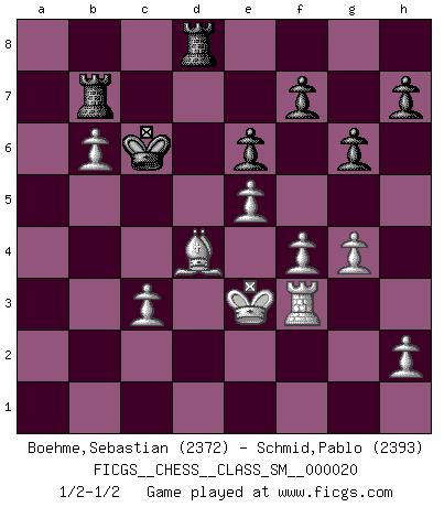 Last move : 1/2-1/2 2018 March 4 21:5:18 [Event "FICGS__CHESS__CLASS_SM__000020"] [Site "FICGS"] [Date "2016.11.25"] [Round "1"] [White "Boehme,Sebastian"] [Black "Schmid,Pablo"] [Result "1/2-1/2"] [WhiteElo "2372"] [BlackElo "2393"] 1.e4 e6 2.d4 d5 3.Nc3 Nf6 4.e5 Nfd7 5.f4 c5 6.Nf3 Nc6 7.Be3 a6 8.Qd2 Qb6 9.Na4 Qb4 10.Qxb4 Nxb4 11.Kd2 b6 12.b3 Bb7 13.c3 Nc6 14.Be2 Be7 15.Rhb1 O-O 16.a3 Rfc8 17.g3 Na5 18.dxc5 bxc5 19.b4 Nc4+ 20.Bxc4 dxc4 21.Ke2 Be4 22.Rd1 Bd3+ 23.Kf2 cxb4 24.axb4 a5 25.b5 Rcb8 26.Nd4 Nc5 27.Nc6 Nxa4 28.Rxa4 Bc2 29.Rda1 Bxa4 30.Rxa4 Rb7 31.b6 Bd8 32.Nxd8 Rxd8 33.Rxa5 Kf8 34.Ra4 Ke7 35.Rxc4 Kd7 36.Ke2 Rc8 37.Rd4+ Ke7 38.Rd3 Rd8 39.Bc5+ Ke8 40.Bd4 Kd7 41.Rf3 g6 42.g4 Kc6 43.Ke3 1/2-1/2 French : Steinitz, Boleslavsky variation Kingside Castling by player Black (move 15) This chess game ended in a draw. Follow this game move after move (download)A Chess game is divided into three stages: the first, when you hope you have the advantage, the second when you believe you have an advantage, and the third... when you know you're going to lose ! (Savielly Tartakower) Wenn du gegen Bobby spielst, ist es keine Frage von gewinnen oder verlieren. Es ist eine Frage des Überlebens. (Boris Vassilievich Spassky) Los libros de Ajedrez deben de usarse igual como usamos los anteojos: para mejorar la vista, aunque algunos jugadores los quieren usar como si ellos les otorgaran la vision. (José Raúl Capablanca) Pour se monter efficace, un Cavalier a besoin d'avant-postes ! Les Cavaliers font les meilleurs bloqueurs de pions passés. The various flowers seem good to different people. (Chinese proverb)