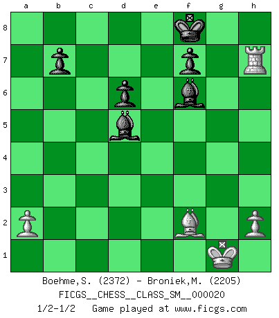 Last move : 1/2-1/2 2017 December 24 13:9:9 [Event "FICGS__CHESS__CLASS_SM__000020"] [Site "FICGS"] [Date "2016.11.25"] [Round "1"] [White "Boehme,Sebastian"] [Black "Broniek,Mariusz Maciej"] [Result "1/2-1/2"] [WhiteElo "2372"] [BlackElo "2205"] 1.e4 c5 2.Nf3 Nc6 3.Nc3 Nf6 4.Bb5 Qc7 5.O-O Nd4 6.Re1 a6 7.Bf1 Ng4 8.e5 Nxf3+ 9.Qxf3 Nxe5 10.Qh5 d6 11.f4 Nc6 12.Nd5 Qd8 13.b3 Nd4 14.Bd3 e5 15.fxe5 Be6 16.c3 g6 17.Nf6+ Qxf6 18.exf6 gxh5 19.cxd4 cxd4 20.Bb2 Kd7 21.Bxd4 h4 22.b4 Rg8 23.b5 Bd5 24.Re2 axb5 25.Bxb5+ Bc6 26.Bd3 Re8 27.Rxe8 Rxg2+ 28.Kf1 Kxe8 29.Bf5 Bh6 30.Re1+ Kf8 31.Bd7 Bxd7 32.Kxg2 Bxd2 33.Rd1 Bf4 34.Bf2 Ba4 35.Rd4 Bc6+ 36.Kg1 Be5 37.Rxh4 Bxf6 38.Rxh7 Bd5 39.Bg3 Bd4+ 40.Bf2 Bf6 1/2-1/2 Sicilian defense Kingside Castling by player White (move 5) This chess game ended in a draw. Follow this game move after move (download)What is the object of playing a gambit opening?... To acquire a reputation of being a dashing player at the cost of losing a game. (Siegbert Tarrasch) Ich suche im Schach immer etwas Eigenes. Riskantes Spiel im Stile schachlicher Musketiere ist nicht meine Sache, auch wenn es vielen Freunden scharfer Wendungen gefällt. (Anatoly Karpov) El Ajedrez es parte de una cultura y si una cultura esta en decadencia, entonces también el Ajedrez declinará. (Mikhail Botvinnik) Seul un grand joueur sait à quel point il joue faiblement. (Xavier Tartacover) All battles are fought by scared men who'd rather be someplace else. (John Wayne in the movie In harm's way)