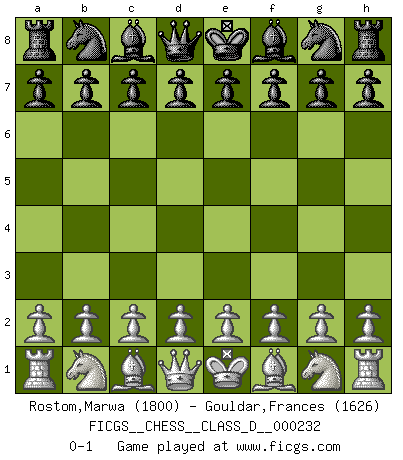Last move : 0-1 2017 January 6 22:55:53 [Event "FICGS__CHESS__CLASS_D__000232"] [Site "FICGS"] [Date "2016.11.27"] [Round "1"] [White "Rostom,Marwa"] [Black "Gouldar,Frances"] [Result "0-1"] [WhiteElo "1800"] [BlackElo "1626"] 0-1 This chess game has been lost on time (started : 2016.11.27 14:26:42) Player Black won this chess game. Follow this game move after move (download)Who is your opponent tonight, tonight I am playing against the Black pieces. (Akiba Rubinstein) Der Partner hat auch seine Existenzberechtigung. (Savielly Grigorievitsch Tartakower) De eso se trata el Ajedrez. Un día le das una lección a tu oponente y al día siguiente el te da una a tí. (Bobby Fischer) Je menace de comprendre la position. (Anonyme) The best weapon against an enemy is another enemy. (Friedrich Nietzsche)