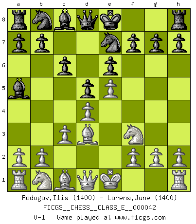 Last move : 0-1 2007 May 16 21:25:47 [Event "FICGS__CHESS__CLASS_E__000042"] [Site "FICGS"] [Date "2007.04.01"] [Round "1"] [White "Podogov,Ilia"] [Black "Lorena,June"] [Result "0-1"] [WhiteElo "1400"] [BlackElo "1400"] 1.e4 c6 2.Nf3 e6 3.d4 d5 4.e5 Bb4+ 5.c3 Ba5 6.Bd3 Ne7 0-1 This chess game has been lost on time (started : 2007.04.01 1:8:27) Caro-Kann defense Player Black won this chess game. Follow this game move after move (download)Adequate compensation for a sacrifice is having a sound combination leading to a winning position; adequate compensation for a blunder is having your opponent snatch defeat from the jaws of victory. (Bruce A. Moon) Es liegt in der Natur, vernüftig zu denken und unlogisch zu handeln. (Anatole France) Los Peones son nacidos libres, y aún así, se encuentran por doquier encadenados. (Rick Kennedy) La tactique est l'élément le plus important du milieu de jeu. (Siegbert Tarrasch) Faith : not wanting to know what is true. (Friedrich Nietzsche)
