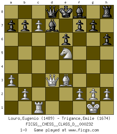Last move : 1-0 2017 January 2 16:31:37 [Event "FICGS__CHESS__CLASS_D__000232"] [Site "FICGS"] [Date "2016.11.27"] [Round "1"] [White "Louro,Eugenio"] [Black "Trigance,Emile"] [Result "1-0"] [WhiteElo "1489"] [BlackElo "1674"] 1.e4 c6 2.d4 d5 3.exd5 cxd5 4.c4 Nf6 5.Nc3 Nc6 6.Bg5 Qa5 7.a3 dxc4 8.d5 Ne5 9.Qd4 Nd3+ 10.Bxd3 cxd3 11.Qxd3 Bd7 12.Nf3 Qb6 13.O-O h6 14.Be3 Qd8 15.Ne5 e6 16.Rfd1 Qe7 17.d6 Qd8 18.Nb5 Nd5 19.Rac1 Rc8 20.Rxc8 Qxc8 21.Rc1 Qd8 22.Nc7+ Nxc7 23.dxc7 1-0 Caro-Kann : Panov-Botvinnik, Czerniak variation Kingside Castling by player White (move 13) Player White won this chess game. Follow this game move after move (download)A man that will take back a move at Chess will pick a pocket. (Richard Fenton) Heutzutage gewinnt im Turnier nicht derjenige Spieler, der weitreichende Pläne entwirft, sondern einfach jener, der Zug um Zug kämpft. (David Bronstein) Si el ingenio solamente fuese necesario para lucirse, las mujeres serían las mejores jugadoras de Ajedrez del mundo. (Albin) Echiquier : carré parfait, comme la Jérusalem nouvelle décrite par l'auteur de l'Apocalypse, huit cases sur huit, exaltation du chiffre 4, symbole du cosmos aux quatre horizons... où le noir et le blanc, l'ombre et la lumière, le mal et le bien s'entremêlent et se conjuguent. (Robert Couffignal, Le Gambit du poète) Success without honor is an unseasoned dish; it will satisfy your hunger, but it won't taste good. (Joe Paterno)