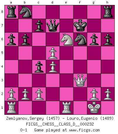 Last move : 0-1 2017 March 10 7:37:50 [Event "FICGS__CHESS__CLASS_D__000232"] [Site "FICGS"] [Date "2016.11.27"] [Round "1"] [White "Zemlyanov,Sergey"] [Black "Louro,Eugenio"] [Result "0-1"] [WhiteElo "1457"] [BlackElo "1489"] 1.e4 d6 2.d4 g6 3.Nc3 Bg7 4.f4 a6 5.Nf3 b6 6.Bc4 Bb7 7.O-O e6 8.f5 d5 9.fxe6 dxc4 10.exf7+ Kxf7 11.Ng5+ Ke8 12.Ne6 Qe7 13.Nd5 Bxd5 14.exd5 Bf6 15.Re1 Kf7 16.Qf3 Qd7 17.Bg5 h6 18.Bxf6 Nxf6 0-1 This chess game has been lost on time (started : 2016.11.27 14:26:42) King's pawn Opening Kingside Castling by player White (move 7) Player Black won this chess game. Follow this game move after move (download)Chess is the art of analysis. (Mikhail Botvinnik) Ein Buch ist ein Spiegel; wenn ein Affe hineinsieht, so kann kein Apostel heraus gucken. (Georg Christoph Lichtenberg) Prefiero perder una partida realmente buena, que ganar una mala. (David Levy) La guerre est enfant de la passion, la passion est enfant du narcissisme et le narcissisme est l'enfant. (...) Une autre partie ? (Thibault de Vassal) It's unlucky to be superstitious. (Dave Enteles)