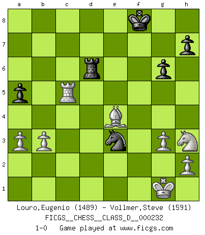 Last move : 1-0 2017 February 25 9:38:42 [Event "FICGS__CHESS__CLASS_D__000232"] [Site "FICGS"] [Date "2016.11.27"] [Round "1"] [White "Louro,Eugenio"] [Black "Vollmer,Steve"] [Result "1-0"] [WhiteElo "1489"] [BlackElo "1591"] 1.Nf3 d5 2.g3 Nf6 3.d4 e6 4.b3 c5 5.Bb2 Nc6 6.e3 Bd6 7.Bg2 O-O 8.O-O b6 9.Nbd2 Bb7 10.c4 Qe7 11.a3 a5 12.cxd5 exd5 13.Re1 Ne4 14.Nh4 g6 15.Nxe4 dxe4 16.d5 Nd8 17.f3 f5 18.fxe4 fxe4 19.Qg4 Bc8 20.Qxe4 Qxe4 21.Bxe4 Bg4 22.Rf1 Nf7 23.Rf6 Be5 24.Bxe5 Nxe5 25.Rxb6 Rab8 26.Rxb8 Rxb8 27.Rb1 Rf8 28.Rc1 Bh3 29.Ng2 Rb8 30.d6 Rd8 31.Rxc5 Ng4 32.Bd5+ Kf8 33.Nf4 Nxe3 34.Nxh3 Rxd6 35.Be4 1-0 Reti : King's Indian attack (Barcza system) Kingside Castling by player Black (move 7) Kingside Castling by player White (move 8) Player White won this chess game. Follow this game move after move (download)If Chess is a science, it's a most inexact one. If Chess is an art, it is too exacting to be seen as one. If Chess is a sport, it's too esoteric. If Chess is a game, it's too demanding to be just a game. If Chess is a mistress, she's a demanding one. If Chess is a passion, it's a rewarding one. If Chess is life, it's a sad one. (Unknown) Versuche, dich von der Sklaverei der Eröffnungsvarianten zu befreien. Stattdessen soll man gewisse Typenpositionen erlernen, die man eingehend analysiert. (Aaron Nimzowitsch) Sin errores no puede haber brillantez. (Emanuel Lasker) Avant la finale, les dieux ont créé le milieu de partie. (Tarrasch) The Internet is the world's largest library. It's just that all the books are on the floor. (John Allen Paulos)