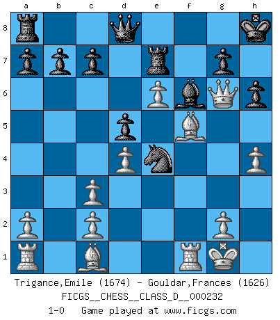 Last move : 1-0 2017 April 3 20:39:43 [Event "FICGS__CHESS__CLASS_D__000232"] [Site "FICGS"] [Date "2016.11.27"] [Round "1"] [White "Trigance,Emile"] [Black "Gouldar,Frances"] [Result "1-0"] [WhiteElo "1674"] [BlackElo "1626"] 1.e4 e5 2.Nc3 Nf6 3.f4 d5 4.fxe5 Nxe4 5.Nf3 Nxc3 6.bxc3 Bg4 7.d4 Be7 8.Be2 O-O 9.O-O Nd7 10.Qe1 Re8 11.Qg3 Bf5 12.Ng5 Bg6 13.h4 h6 14.Nf3 Kh8 15.e6 Nf6 16.Ne5 Ne4 17.Nxg6+ fxg6 18.Qxg6 Bf6 19.Bg4 Re7 20.Bf5 1-0 Vienna gambit Kingside Castling by player Black (move 8) Kingside Castling by player White (move 9) Player White won this chess game. Follow this game move after move (download)Via the squares on the chessboard, the Indians explain the movement of time and the age, the higher influences which control the world and the ties which link Chess with the human soul. (Al-Masudi) Schach ist die gewalttätigste aller Sportarten. (Garry Kasparov) Dejen al perfeccionista jugar por correo. (Yasser Seirawan) Donnez-moi un Cavalier en 6e et je gagnerais toutes mes parties. (Steinitz) No enterprise is more likely to succeed than one concealed from the enemy until it is ripe for execution. (Niccolo Machiavelli)