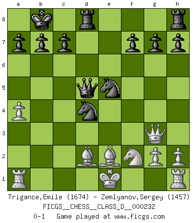 Last move : 0-1 2017 January 31 8:51:6 [Event "FICGS__CHESS__CLASS_D__000232"] [Site "FICGS"] [Date "2016.11.27"] [Round "1"] [White "Trigance,Emile"] [Black "Zemlyanov,Sergey"] [Result "0-1"] [WhiteElo "1674"] [BlackElo "1457"] 1.e4 e5 2.Nc3 Nf6 3.f4 d5 4.fxe5 Nxe4 5.Nf3 Bc5 6.Qe2 Bf5 7.Nd1 Bg4 8.d3 Bxf3 9.Qxf3 Ng5 10.Qg3 Ne6 11.c3 d4 12.Be2 Nc6 13.Nf2 Qd5 14.Ne4 Bb6 15.a4 dxc3 16.bxc3 O-O-O 17.Bd2 Kb8 18.Nf2 Nxe5 19.d4 Bxd4 20.cxd4 Nxd4 0-1 Vienna gambit Queenside Castling by player Black (move 16) Player Black won this chess game. Follow this game move after move (download)In blitz, the Knight is stronger than the Bishop. (Vlastimil Hort) Im Leben werden Partien nie so unstrittig gewonnen wie im Spiel (Emanuel Lasker) Las ideas audaces son como las piezas del Ajedrez que avanzan hacia adelante. Ellas pueden ser vencidas, pero también pueden iniciar una partida victoriosa. (Goethe) Le système Elo représente seulement une moyenne. Il est simplement un indicateur de votre stabilité. (Anatoli Karpov) Strategy without tactics is the slowest route to victory. Tactics without strategy is the noise before defeat. (Sun Tzu)