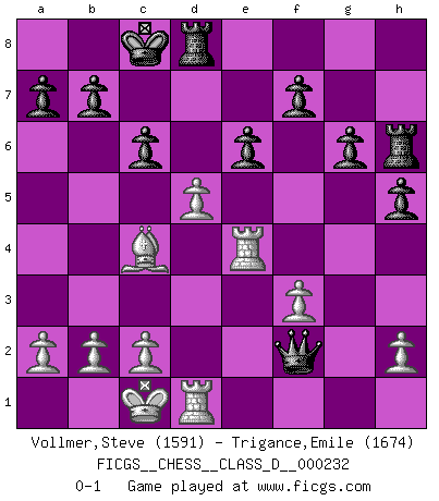 Last move : 0-1 2016 December 31 11:14:11 [Event "FICGS__CHESS__CLASS_D__000232"] [Site "FICGS"] [Date "2016.11.27"] [Round "1"] [White "Vollmer,Steve"] [Black "Trigance,Emile"] [Result "0-1"] [WhiteElo "1591"] [BlackElo "1674"] 1.e4 c6 2.d4 d5 3.Nc3 dxe4 4.Nxe4 Nd7 5.Qe2 Ndf6 6.Nf3 Bg4 7.Nxf6+ Nxf6 8.Be3 Nd5 9.O-O-O Nxe3 10.Qxe3 g6 11.Bc4 h5 12.Qf4 e6 13.Rhe1 Bh6 14.Qxh6 Rxh6 15.Re5 Bxf3 16.gxf3 Qh4 17.Re4 Qxf2 18.d5 O-O-O 0-1 Caro-Kann : Steinitz variation Queenside Castling by player White (move 9) Queenside Castling by player Black (move 18) Player Black won this chess game. Follow this game move after move (download)Any material change in a position must come about by mate, a capture, or a Pawn promotion. (Purdy) Ich würde die 30 stärksten Spieler der USA im Simultanspiel besiegen. (José Raúl Capablanca) Estaba muy claro de que el punto vulnerable del Gran Maestro Americano (Bobby Fischer) radicaba en las posiciones de doble filo, colgantes, irracionales, donde el siempre falló en encontrar un triunfo aún en una posición de clara victoria. (Efim Geller) Ce qui est bien, c'est d'avoir tout un tas de pièces en prise : l'adversaire ne peut en prendre qu'une à la fois. Cité par Thierry Audin. The real danger is not that computers will begin to think like men, but that men will begin to think like computers. (Sydney J. Harris)