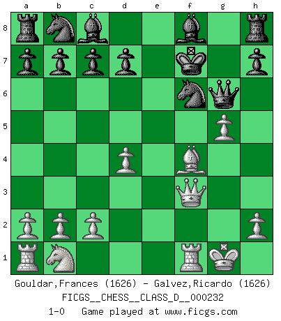 Last move : 1-0 2017 May 21 5:19:47 [Event "FICGS__CHESS__CLASS_D__000232"] [Site "FICGS"] [Date "2016.11.27"] [Round "1"] [White "Gouldar,Frances"] [Black "Galvez,Ricardo"] [Result "1-0"] [WhiteElo "1626"] [BlackElo "1626"] 1.e4 e5 2.f4 exf4 3.Nf3 g5 4.Bc4 g4 5.O-O gxf3 6.Qxf3 Qf6 7.e5 Qxe5 8.Bxf7+ Kxf7 9.d4 Qf5 10.g4 Qg6 11.Bxf4 Nf6 12.g5 1-0 This chess game has been lost on time (started : 2016.11.27 14:26:42) KGA : Muzio gambit Kingside Castling by player White (move 5) Player White won this chess game. Follow this game move after move (download)Chess books should be used as we use glasses: to assist the sight, although some players make use of them as if they thought they conferred sight. (Jose Raul Capablanca) Wenn sie aufgeben, dann danke ich Ihnen für das Spiel (Eventualzug beim Fernschach). (Anonymous) Debemos de asegurarnos de que el Ajedrez no se convierta en un lenguaje muerto, muy interesante, pero tan solo para un grupo muy pequeño. (Sytze Faber) Vouloir jouer aux échecs contre soi-même est aussi paradoxal que vouloir marcher sur son ombre. (Stefan Zweig) SEO proverb : Make your website optimized for human beings, not for search engines.