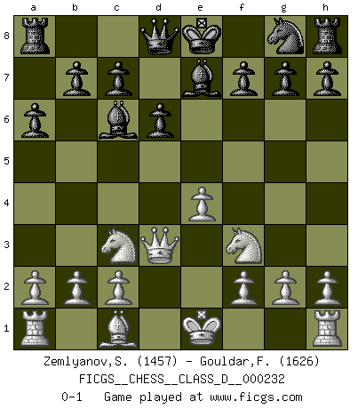 Last move : 0-1 2017 February 21 4:27:51 [Event "FICGS__CHESS__CLASS_D__000232"] [Site "FICGS"] [Date "2016.11.27"] [Round "1"] [White "Zemlyanov,Sergey"] [Black "Gouldar,Frances"] [Result "0-1"] [WhiteElo "1457"] [BlackElo "1626"] 1.e4 e5 2.Nf3 Nc6 3.Bb5 d6 4.d4 exd4 5.Qxd4 Bd7 6.Qd3 a6 7.Bxc6 Bxc6 8.Nc3 Be7 0-1 This chess game has been lost on time (started : 2016.11.27 14:26:42) Comment by player 2 : Frances Gouldar : Hello and good game ! Ruy Lopez : Old Steinitz defense Player Black won this chess game. Follow this game move after move (download)Place the contents of the Chess box in a hat, shake them up vigorously, pour them on the board from a height of two feet, and you get the style of Steinitz. (H. E. Bird) Spiel ein langweiliges Spiel zu Ende und lustige Dinge können passieren. (Hans Ree) El Ajedrez, como cualquier actividad creativa, solo puede existir a través del esfuerzo combinado de aquellos que tienen talento creativo y de aquellos que poseen la habilidad de organizar su trabajo creativo. (Mikhail Botvinnik) Les échecs, c'est l'imagination. (David Bronstein) All politicians must be presumed guilty until they are proven innocent. (Dinesh De Silva)