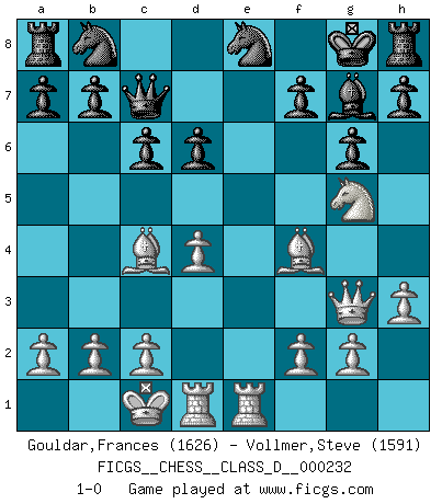 Last move : 1-0 2017 January 28 11:2:44 [Event "FICGS__CHESS__CLASS_D__000232"] [Site "FICGS"] [Date "2016.11.27"] [Round "1"] [White "Gouldar,Frances"] [Black "Vollmer,Steve"] [Result "1-0"] [WhiteElo "1626"] [BlackElo "1591"] 1.e4 d6 2.d4 Nf6 3.Nc3 g6 4.Bf4 Bg7 5.Nf3 Bg4 6.h3 Bxf3 7.Qxf3 c6 8.O-O-O Qc7 9.e5 Nfd7 10.exd6 exd6 11.Bc4 Nf6 12.Rhe1+ Kf8 13.Qg3 Ne8 14.Ne4 Kg8 15.Ng5 1-0 Pirc defense Queenside Castling by player White (move 8) Player White won this chess game. Follow this game move after move (download)We cannot resist the fascination of sacrifice, since a passion for sacrifices is part of a Chessplayer's nature. (Rudolf Spielman) Fischer ist das größte Genie, das je vom Schachhimmel heruntergestiegen ist. (Mikhail Nekhemyevich Tal) El Ajedrez expande y enriquece tu mente. (Saudin Robovic) À la honte des hommes, on sait que les lois du jeu sont les seules qui soient partout justes, claires, inviolables et exécutées. Pourquoi l'Indien qui a donné les règles du jeu d'échecs est-il obéi de bon gré dans toute la terre, et que les décrétales des papes, par exemple, sont aujourd'hui un objet d'horreur et de mépris ? C'est que l'inventeur des échecs combina tout avec justesse pour la satisfaction des joueurs, et que les papes, dans leurs décrétales, n'eurent en vue que leur seul avantage. L'Indien voulut exercer également l'esprit des hommes et leur donner du plaisir; les papes ont voulu abrutir l'esprit des hommes. Voltaire (Dictionnaire philosophique / Garnier 1967) All the troubles of the world come from being unable to sit alone in a quiet room. (Blaise Pascal)