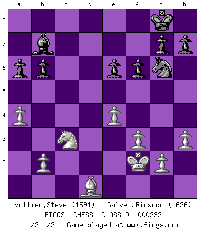 Last move : 1/2-1/2 2017 January 20 12:47:55 [Event "FICGS__CHESS__CLASS_D__000232"] [Site "FICGS"] [Date "2016.11.27"] [Round "1"] [White "Vollmer,Steve"] [Black "Galvez,Ricardo"] [Result "1/2-1/2"] [WhiteElo "1591"] [BlackElo "1626"] 1.d4 d5 2.c4 dxc4 3.e3 Nf6 4.Bxc4 e6 5.Nf3 c5 6.O-O a6 7.dxc5 Qxd1 8.Rxd1 Bxc5 9.a4 Nc6 10.Nc3 O-O 11.Bd2 b6 12.Rac1 Rd8 13.e4 Ng4 14.Be1 Bb7 15.h3 Nge5 16.Be2 Nxf3+ 17.Bxf3 Ne5 18.Be2 f6 19.Kf1 Ng6 20.f3 Be3 21.Rxd8+ Rxd8 22.Rd1 Rxd1 23.Bxd1 Bc5 24.Bf2 Bxf2 25.Kxf2 1/2-1/2 Queen's gambit accepted Kingside Castling by player White (move 6) Kingside Castling by player Black (move 10) This chess game ended in a draw. Follow this game move after move (download)In Chess, as it is played by masters, chance is practically eliminated. (Emanuel Lasker) Er war ein guter Schachspieler, aber ich kann Leute nicht ausstehen, die 'Heil Hitler' rufen (Über Alexander Aljechin). (Miguel Najdorf) Sin errores no puede haber brillantez. (Emanuel Lasker) Comme les marins qui ont mille raisons différentes d'aller en mer, les joueurs d'échecs en ont tout autant avant de s'installer devant une table et jouer... (Vincent Bertignac, philosophe) I'm extremely disappointed. I send you out for exciting, new designer drugs, you come back with tomato sauce. (Gregory House, House M.D.)
