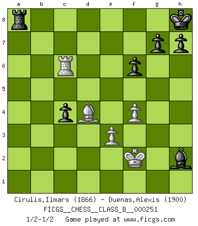Last move : 1/2-1/2 2016 December 3 15:15:7 [Event "FICGS__CHESS__CLASS_B__000251"] [Site "FICGS"] [Date "2016.11.28"] [Round "1"] [White "Cirulis,Ilmars"] [Black "Duenas,Alexis"] [Result "1/2-1/2"] [WhiteElo "1866"] [BlackElo "1900"] 1.b4 e5 2.a3 d5 3.Bb2 Bd6 4.Nf3 Nd7 5.c4 dxc4 6.e3 a5 7.Bxc4 Ngf6 8.d3 axb4 9.O-O c6 10.axb4 Rxa1 11.Bxa1 b5 12.Bb3 O-O 13.Qc2 Bb7 14.Nbd2 Qe7 15.d4 exd4 16.Nxd4 Bxb4 17.Rd1 Qc5 18.Qd3 Qh5 19.Nf5 Nc5 20.Qb1 Nxb3 21.Nxb3 Ne4 22.Nbd4 c5 23.Ne7+ Kh8 24.f3 Nd2 25.Qf5 Qxf5 26.Ndxf5 f6 27.Nd6 Ba8 28.Kf2 c4 29.Nxb5 Nxf3 30.gxf3 Bxe7 31.Rd7 Re8 32.Nd6 Bc6 33.Rc7 Bxd6 34.Rxc6 Bxh2 35.f4 Ra8 36.Bd4 1/2-1/2 Polish (Sokolsky) opening Kingside Castling by player White (move 9) Kingside Castling by player Black (move 12) This chess game ended in a draw. Follow this game move after move (download)Fischer sacrificed virtually everything most of us weakies (to use his term) value, respect, and cherish, for the sake of an artful, often beautiful board game, for the ambivalent privilege of being its greatest master. (Paul Kollar) Es ist im Leben wie im Schachspiel. Wir entwerfen einen Plan, dieser bleibt jedoch bedingt durch das, was im Schachspiel dem Gegner, im Leben dem Schicksal zu tun belieben wird. (Arthur Schopenhauer) Un sacrificio se refuta mucho mejor al aceptarlo. (Wilhelm Steinitz) La vie est comme un jeu d'échecs : nous esquissons un plan, mais celui-ci est tributaire de ce que daignent faire l'adversaire aux échecs et le destin dans la vie. (Arthur Schopenhauer) A bird doesn't sing because it has an answer, it sings because it has a song. (Maya Angelou)