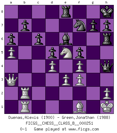 Last move : 0-1 2016 December 10 23:22:50 [Event "FICGS__CHESS__CLASS_B__000251"] [Site "FICGS"] [Date "2016.11.28"] [Round "1"] [White "Duenas,Alexis"] [Black "Green,Jonathan"] [Result "0-1"] [WhiteElo "1900"] [BlackElo "1988"] 1.d4 f5 2.Nf3 Nf6 3.g3 e6 4.Bg2 d5 5.O-O Bd6 6.c4 c6 7.Bf4 Bxf4 8.gxf4 O-O 9.Nc3 dxc4 10.e3 Nd5 11.Rc1 Nd7 12.b3 cxb3 13.Qxb3 Rf6 14.Nxd5 exd5 15.Rc2 Rh6 16.a4 Nf6 17.Ne5 Ne4 18.Rb1 Qh4 19.Nf3 Qe7 20.Ne5 Nd6 21.Qa3 Be6 22.a5 a6 23.Rcb2 Re8 24.Bf1 Kh8 25.Kh1 Qh4 26.f3 Nf7 0-1 Dutch Kingside Castling by player White (move 5) Kingside Castling by player Black (move 8) Player Black won this chess game. Follow this game move after move (download)Of all my Russian books, the defense contains and diffuses the greatest 'warmth' which may seem odd seeing how supremely abstract Chess is supposed to be. (Vladimir Nabokov) Schach ist Kampf, hauptsächlich jedoch gegen die eigenen Fehler. (Savielly Grigorievitsch Tartakower) En el Ajedrez, tal como en la vida, las bendiciones de hoy pueden ser el veneno del mañana. (Assaic) On peut tirer plus d'utilité d'une partie perdue que de 100 parties gagnées. (Capablanca) I know the human being and fish can coexist peacefully. (George W. Bush, Saginaw sept. 29, 2000)