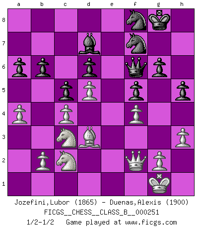 Last move : 1/2-1/2 2017 March 27 15:22:17 [Event "FICGS__CHESS__CLASS_B__000251"] [Site "FICGS"] [Date "2016.11.28"] [Round "1"] [White "Jozefini,Lubor"] [Black "Duenas,Alexis"] [Result "1/2-1/2"] [WhiteElo "1865"] [BlackElo "1900"] 1.d4 Nf6 2.Bg5 Ne4 3.Bf4 c5 4.f3 Qa5+ 5.c3 Nf6 6.d5 Qb6 7.Bc1 d6 8.Na3 e6 9.e4 exd5 10.exd5 Be7 11.Ne2 O-O 12.Ng3 Re8 13.Be2 Nbd7 14.O-O Bf8 15.Re1 a6 16.Nc4 Qc7 17.a4 b6 18.Bf4 g6 19.Ne3 Rb8 20.c4 h5 21.Qd2 Ne5 22.Nd1 Nh7 23.h3 f5 24.Be3 Bg7 25.f4 Nf7 26.Bd3 Bd7 27.Nc3 Rxe3 28.Rxe3 Bd4 29.Nf1 Re8 30.Rae1 Qd8 31.Qf2 Bxe3 32.Rxe3 Rxe3 33.Nxe3 Qf6 34.Nc2 Nf8 1/2-1/2 Trompowsky attack (Ruth, Opovcensky Opening) Kingside Castling by player Black (move 11) Kingside Castling by player White (move 14) This chess game ended in a draw. Follow this game move after move (download)The hardest game to win is a won game. (Emanuel Lasker) Schach ist ein Teil der Kultur, und wenn es mit der Kultur abwärts geht, geht es auch mit dem Schach abwärts. (Mikhail Moiseyevich Botvinik) Dejen al perfeccionista jugar por correo. (Yasser Seirawan) Vous m'avez demandé de vous exposer quel est le fondement de la prière. Je ne fais que préparer les pièces du jeu sur la table... Nous sera-t-il permis d'en adopter les règles et si nous les appliquons scrupuleusement nous ne tarderons pas à faire mat le Roi divin ! Il ne pourra échapper à nos mains. (Sainte Thérèse d'Avila, Chemin de perfection) To steal ideas from one person is plagiarism. To steal from many is research. (Unknown)