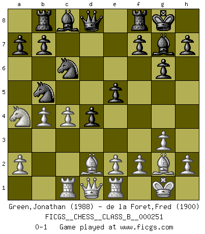 Last move : 0-1 2017 April 20 0:13:16 [Event "FICGS__CHESS__CLASS_B__000251"] [Site "FICGS"] [Date "2016.11.28"] [Round "1"] [White "Green,Jonathan"] [Black "de la Foret,Fred"] [Result "0-1"] [WhiteElo "1988"] [BlackElo "1900"] 1.c4 Nf6 2.Nc3 c5 3.Nf3 e6 4.g3 g6 5.Bg2 Bg7 6.d4 cxd4 7.Nxd4 O-O 8.O-O Nc6 9.Ndb5 d5 10.Bf4 d4 11.Bc7 Qd7 12.Na4 Ne8 13.Bf4 Qd8 14.Bd2 Nc7 15.Rc1 e5 16.b4 Rb8 17.Re1 Nxb5 0-1 English Opening Kingside Castling by player Black (move 7) Kingside Castling by player White (move 8) Player Black won this chess game. Follow this game move after move (download)Good offense and good defense both begin with good development. (Bruce A. Moon) Die Neutralität betrachte ich als eine schwere Krankheit. (Viktor Kortschnoi) Debemos de asegurarnos de que el Ajedrez no se convierta en un lenguaje muerto, muy interesante, pero tan solo para un grupo muy pequeño. (Sytze Faber) Le pion, dans sa simplicité, marche droit devant lui, mais lorsqu'il prend, il le fait obliquement? Ainsi l'homme, tant qu'il reste pauvre, marche dans la droiture et vit honnêtement, mais lorsqu'il recherche les honneurs, il flatte, se parjure et, par les voies obliques, cherche une position supérieure sur l'échiquier du monde. (Jean de Galles) Perseverance does not equal worthiness. Next time you want to get my attention, wear something fun. Low-riding jeans are hot. (Gregory House, House M.D.)