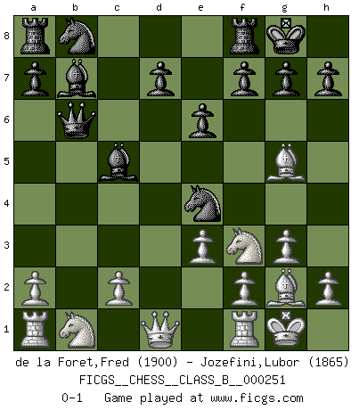 Last move : 0-1 2017 March 4 14:22:34 [Event "FICGS__CHESS__CLASS_B__000251"] [Site "FICGS"] [Date "2016.11.28"] [Round "1"] [White "de la Foret,Fred"] [Black "Jozefini,Lubor"] [Result "0-1"] [WhiteElo "1900"] [BlackElo "1865"] 1.d4 Nf6 2.Bg5 c5 3.dxc5 e6 4.b4 b6 5.Nf3 bxc5 6.bxc5 Bb7 7.g3 Bxc5 8.Bg2 Qb6 9.O-O Ne4 10.e3 O-O 0-1 Trompowsky attack (Ruth, Opovcensky Opening) Kingside Castling by player White (move 9) Kingside Castling by player Black (move 10) Player Black won this chess game. Follow this game move after move (download)I don't believe in psychology. I believe in good moves. (Bobby Fischer) Glücklicherweise sind Großmeister Ruben Fines reine Schachbücher weniger phallozentrisch [als seine Schachpsychologie] und deswegen auch weniger lächerlich. (Nigel Short) El Ajedrez, como cualquier actividad creativa, solo puede existir a través del esfuerzo combinado de aquellos que tienen talento creativo y de aquellos que poseen la habilidad de organizar su trabajo creativo. (Mikhail Botvinnik) Le profane ne songe pas à la somme de jouissance dont il se prive, qui méconnaît ce jeu aux ressources aussi variées que passionnantes. (Jean-Marie Jeanton-Lamarche) Fortune favours the audacious. (Desiderius Erasmus)