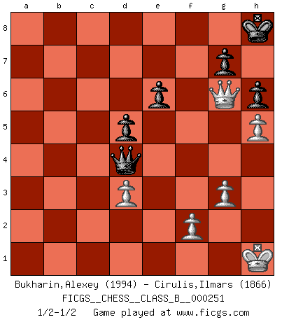 Last move : 1/2-1/2 2017 March 1 19:51:52 [Event "FICGS__CHESS__CLASS_B__000251"] [Site "FICGS"] [Date "2016.11.28"] [Round "1"] [White "Bukharin,Alexey"] [Black "Cirulis,Ilmars"] [Result "1/2-1/2"] [WhiteElo "1994"] [BlackElo "1866"] 1.e4 e6 2.d4 d5 3.Nc3 Bb4 4.e5 c5 5.a3 Bxc3+ 6.bxc3 Ne7 7.Qg4 Kf8 8.Bd2 b6 9.Bd3 Ba6 10.Nf3 Bxd3 11.cxd3 cxd4 12.cxd4 Nbc6 13.O-O Rc8 14.Rfc1 Nf5 15.Rc3 h6 16.Rac1 Qd7 17.h4 Kg8 18.h5 Kh7 19.Qf4 Nfe7 20.Kh1 b5 21.Rc5 a5 22.Rb1 Rb8 23.Rcxb5 Rxb5 24.Rxb5 Nxe5 25.a4 Nxf3 26.Qxf3 Nc6 27.Qf4 Ra8 28.g3 Nb4 29.Bxb4 axb4 30.Rxb4 Rxa4 31.Rxa4 Qxa4 32.Qxf7 Qxd4 33.Qg6+ Kh8 34.Qe8+ Kh7 35.Qg6+ Kh8 1/2-1/2 French : Winawer, Advance, poisoned pawn variation Kingside Castling by player White (move 13) This chess game ended in a draw. Follow this game move after move (download)Chess is not like life... it has rules ! (Mark Pasternak) Weshalb minderdergeübte Spieler mit g2-g4 beginnen? Die betreffenden sind unschlüssig, ob sie nun rechts (h4) oder links (f4) beginnen sollen, und in ihrer Ratlosigkeit entschliessen sie sich nach guter Bürgerart dazu, den goldenen Mittelweg zu wählen. (Aaron Nimzowitsch) ¿Cual es el objetivo de jugar una apertura de gambito?... Para adquirir una reputación de ser un jugador apuesto a costo de perder el juego. (Siegbert Tarrasch) Le système Elo représente seulement une moyenne. Il est simplement un indicateur de votre stabilité. (Anatoli Karpov) The ultimate in disposing one's troops is to be without ascertainable shape. Then the most penetrating spies cannot pry in nor can the wise lay plans against you. (Sun Tzu)