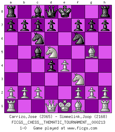 Last move : 1-0 2017 January 9 16:38:2 [Event "FICGS__CHESS__THEMATIC_TOURNAMENT__000213"] [Site "FICGS"] [Date "2016.11.29"] [Round "1"] [White "Carrizo,Jose"] [Black "Simmelink,Joop"] [Result "1-0"] [WhiteElo "2065"] [BlackElo "2168"] 1.e4 e5 2.Nf3 Nc6 3.Nc3 Nf6 4.d4 exd4 5.Nd5 Bc5 6.Bg5 1-0 Four knights : Belgrade gambit Player White won this chess game. Follow this game move after move (download)What would Chess be without silly mistakes ? (Kurt Richter) Ich brauche nur einen Blick auf das Schachbrett zu werfen, und weiß schon, was in der Stellung steckt, was geschehen kann und was geschehen wird. Alle übrigen suchen und prüfen, ich aber weiß es! (José Raúl Capablanca) Mis oponentes también hacen buenas movidas. A veces yo no tomo esas cosas en consideración. (Bobby Fischer) Vous n'êtes pas toujours obligé de jouer le meilleur coup. Un coup doit être actif, entreprenant, correct et beau ! (David Bronstein) The right perception of any matter and a misunderstanding of the same matter do not wholly exclude each other. (Kafka's the trial)